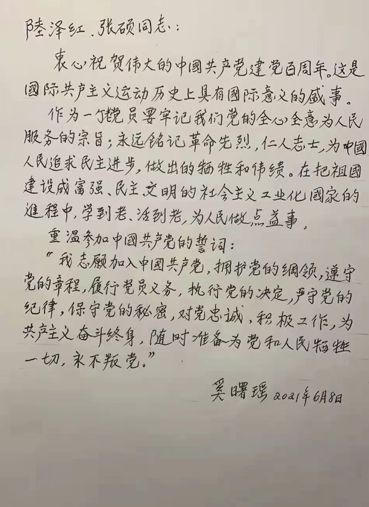 奚曙瑶老师亲手书写的对党百年华诞的祝福