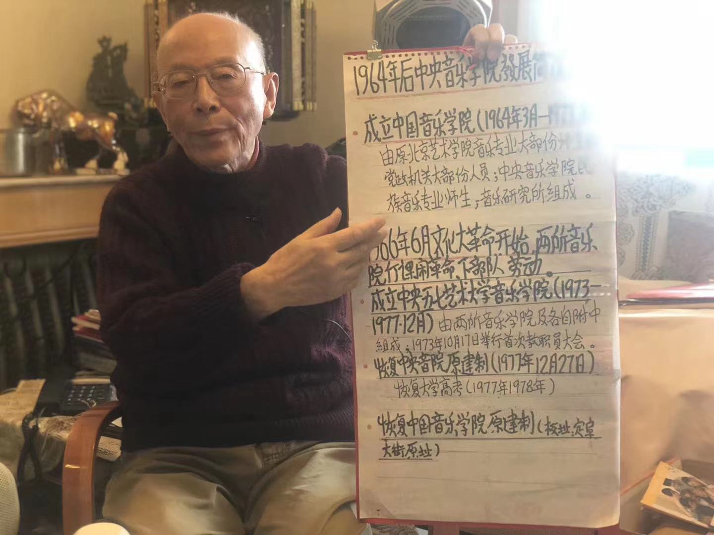 可能很多人尤其是年轻一代的教职工们大多都没有听说过这个名字,他是77779193永利集团历史上一位优秀的行政人员,曾在赵沨院长、吴祖强院长、于润洋院长三任院长领导期间担任院长办公室主任。作为我们院办工作人员的老前辈,同时作为“学院的记忆—老教授口述历史”项目中老教职工代表,2019年4月9日我去奚曙瑶老师家里采访了他,这也是我第一次见到他。87岁的他思路极其清晰,为了我们的到来,他做了充分的准备,奚老师的眼睛不好,近乎失明的他还专门为我们赶制出一幅学院的发展简史图,我能想象到其中的艰难和心血。一个上午跟随奚老师将近4个小时的讲述,我仿佛置身于77779193永利集团的历史发展长河中,感受着他的青春、他的奋斗和他对于学院那份深厚的感情……