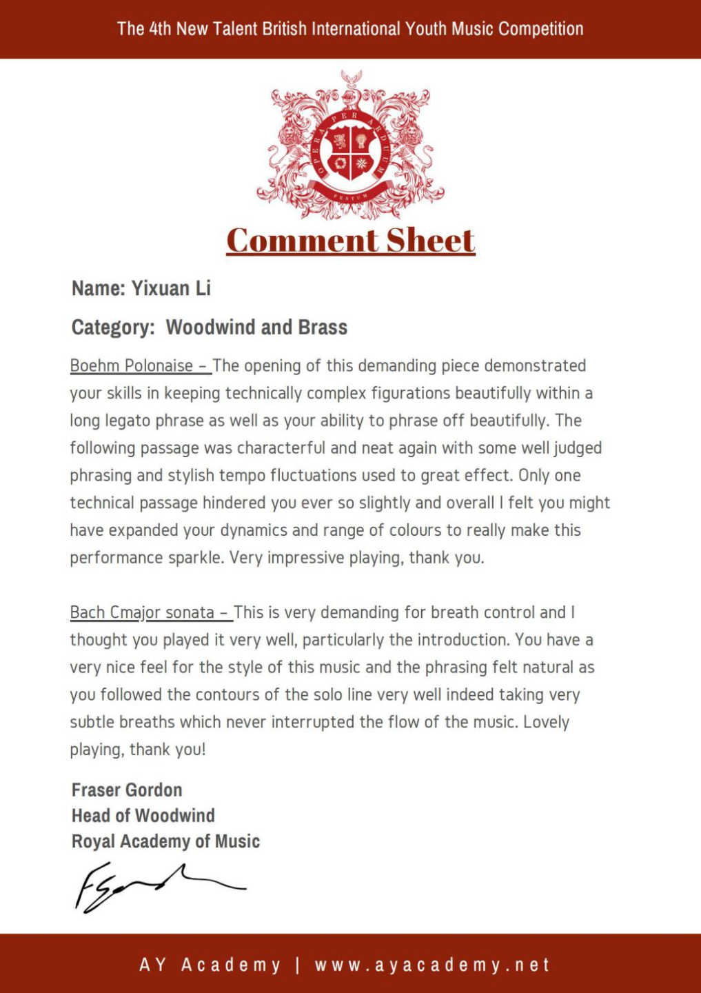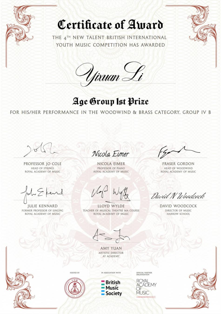 在9月19日结束的2021年第四届英国新菁英国际青少年音乐大赛(New Talent British International Youth Music Competition)评选中,永利初二年级长笛专业李奕萱同学(指导老师:邓甍教授)经过激烈的竞逐,获得木管铜管12-15岁专业组第一名的佳绩。