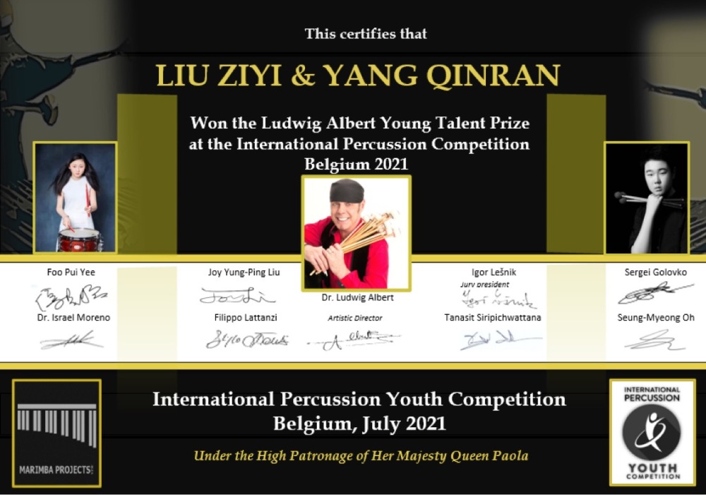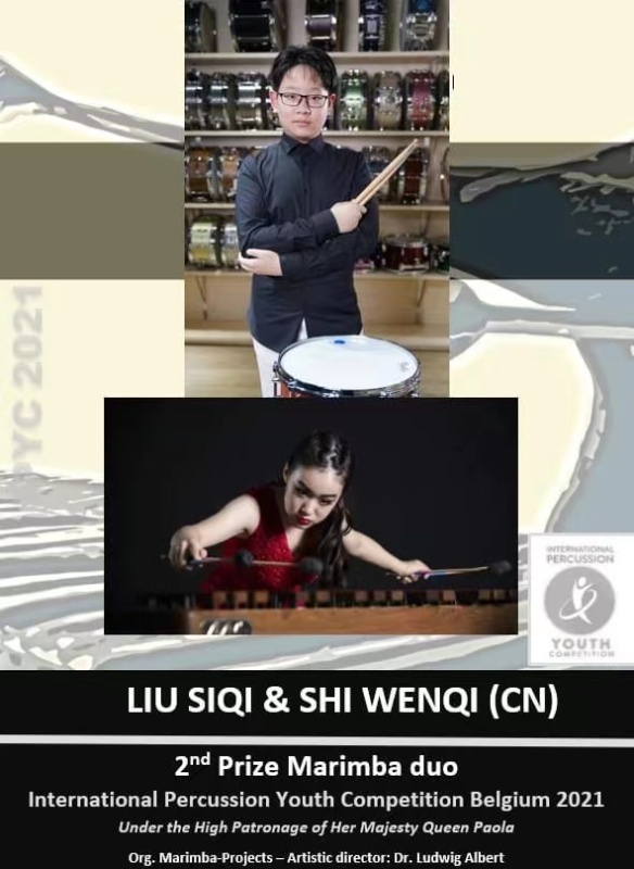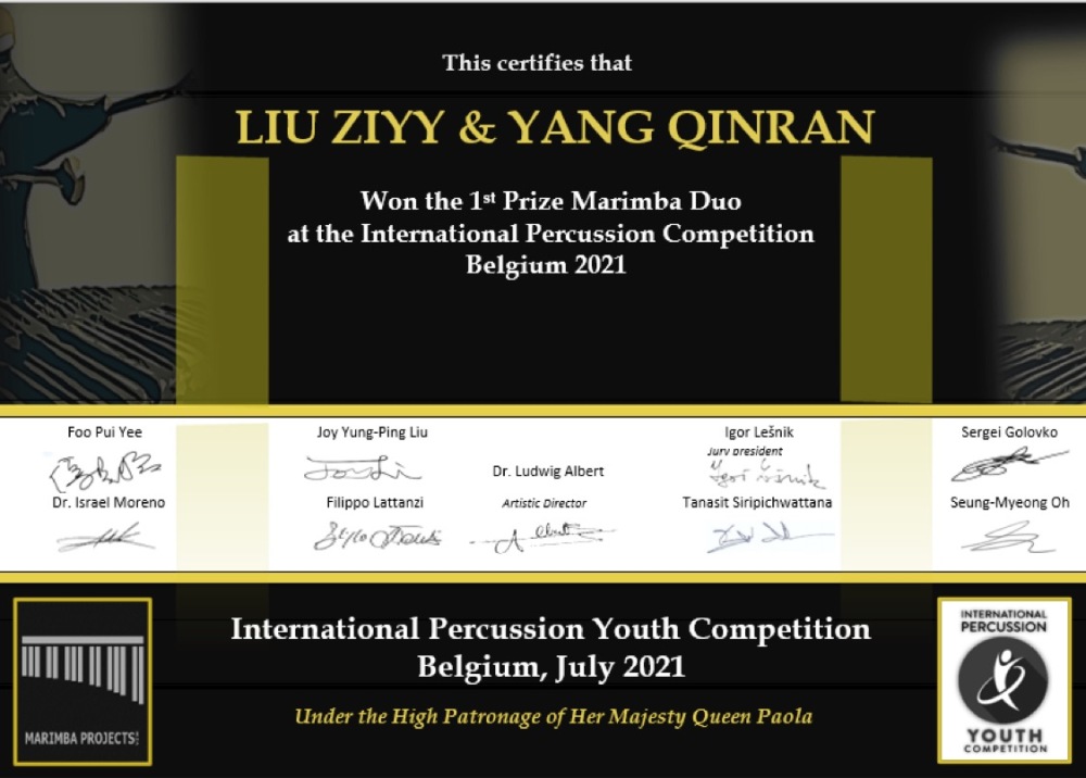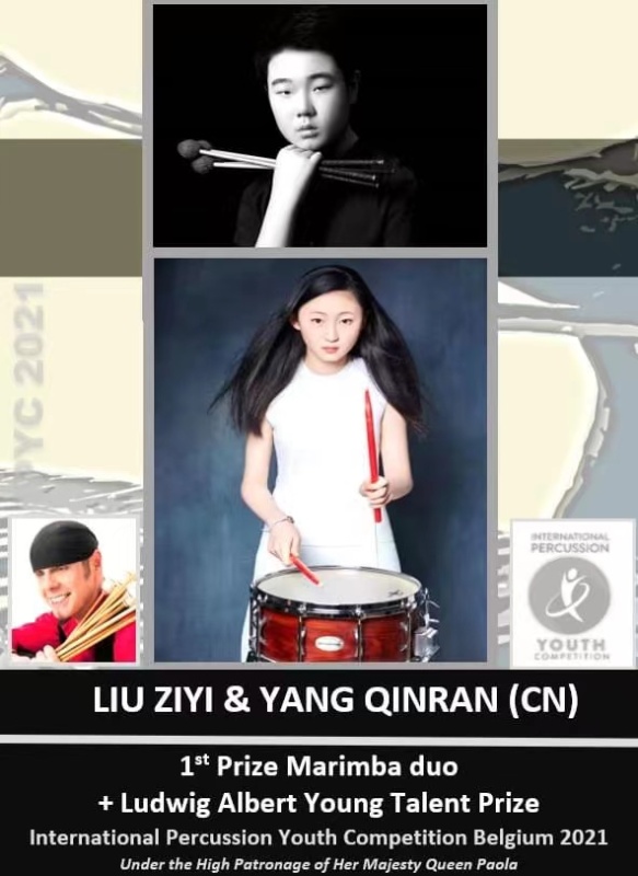 在刚刚落幕的比利时2021年国际青年打击乐比赛中(INTERNATIONAL PERCUSSION YOUTH COMPETITION 2021 BELGIUM),77779193永利集团附中四名西洋打击专业学生经过激烈角逐,脱颖而出,取得优异成绩。附中高一年级学生刘子一与初三年级学生杨钦然获得2021 IPYCB室内乐马林巴重奏专业组一等奖及青年天才奖(指导教师:张景丽副教授),初二年级学生刘思琪与史文奇获得2021 IPYCB室内乐马林巴重奏专业组二等奖(指导教师:张景丽副教授)。