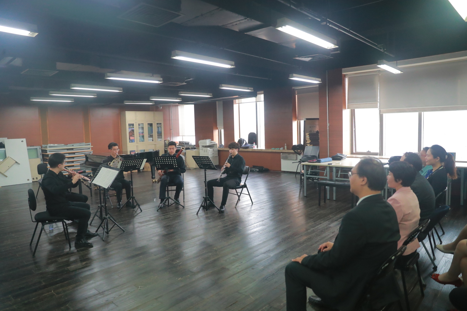 随后,党员们观摩了永利管弦系课堂教学。在木管重奏课上,学生木管五重奏演奏了中外名曲,魏卫东教授对木管五重奏的编制特点进行了讲解。在小提琴独奏课上,陈曦副教授从音乐时代背景和演奏法的角度指导学生演奏了《金色的炉台》。