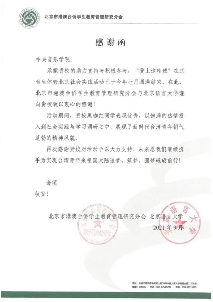 近期,永利收到了来自北京市港澳台侨学生教育管理研究分会主办,北京语言大学的感谢函,感谢永利对“爱上这座城”在京台生体验北京社会实践活动的鼎立支持和积极参与,以及台生黑珈红同学的优秀表现,展现了当代台湾朝气蓬勃的精神风貌。