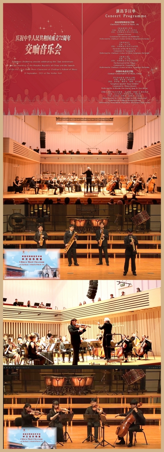 9月21日,中国驻曼彻斯特总领事馆和切特姆音乐学校在斯托勒音乐厅联合举办交响音乐会,庆祝中华人民共和国成立72周年暨中文音乐教室正式启动。英王大曼彻斯特司法都督霍金斯、英王默西塞德郡司法都督兰斯利、博尔顿市长汤姆斯、奥尔德姆市长哈里森、斯托克波特市长诺丁汉、特拉福德副市长博伊斯、英王副官杨钜文、英王副官任洁仪、英国对华事务全国委员会执行总监谢尔、大曼彻斯特英中协会执行总监申瑞、大曼彻斯特招商投资主任马天明、切特姆音乐学校校董会主席巴恩斯、切特姆音乐学校联合校长雷蒙德和史密斯及来自曼彻斯特、利物浦、约克、谢菲尔德等地的华侨华人、留学生和中资企业代表出席。由于疫情防控原因,中国驻曼彻斯特总领事郑曦原、英王大曼彻斯特代表史密斯爵士、曼彻斯特市长乔吉通过视频发表讲话,共祝英中友谊历久弥坚。