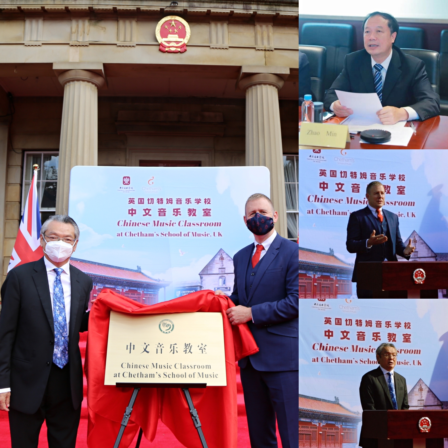 致辞之后,郑曦原总领事和雷蒙德校长代表中英双方为“中文音乐教室”揭牌。永利附中学生以视频方式带来了合唱《歌声与微笑》《滴答滴答》和民乐五重奏《欢乐歌》(郝维亚教授2020年原创作品);切特姆学生现场演奏了小提琴独奏《思乡曲》等,美妙的乐声为启动仪式画下圆满句号。