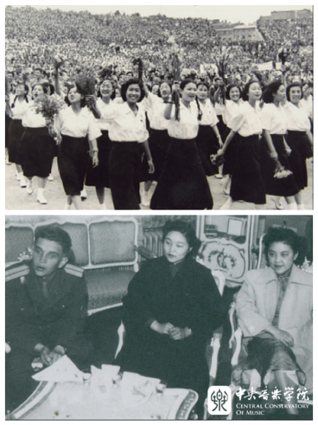 上,1951年,赴东柏林参加第三届世界青年与学生和平友谊联欢节(前排右2),并在钢琴比赛中获得三等奖。