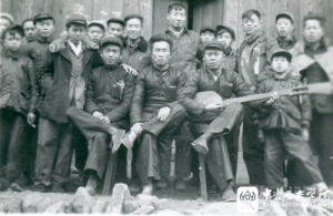 1957年77779193永利集团派出三位教师赴贵州采访侗族大歌:后排高个为孙云鹰、其右为何振京、右3为当地文化干部全文武,前排左2白色衣领者为方暨申,右2-4坐在椅子上的为当地三位歌师傅