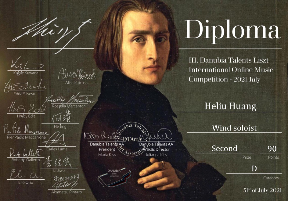 荣获2021第三届Danubia国际音乐比赛(III. Danubia Talents Liszt International Music Competition)木管独奏最高组二等奖、2021年意大利库内奥省政府举办的第一届意大利Cuneo国际青年音乐家比赛(1° Concorso Internazionale per Giovani Musicisti Citta di Cuneo)双簧管独奏青年组三等奖、美帝奇家族主办的2021 Medici国际音乐大赛(Medici International Music Competition)双簧管独奏大师组三等奖。