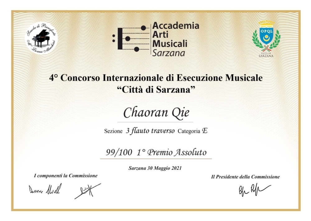 在近期结束的2021年第四届意大利萨尔扎纳城国际音乐比赛中,永利高二年级郄超然同学获得了长笛专业E组特等奖!(指导教师:李凌副教授)