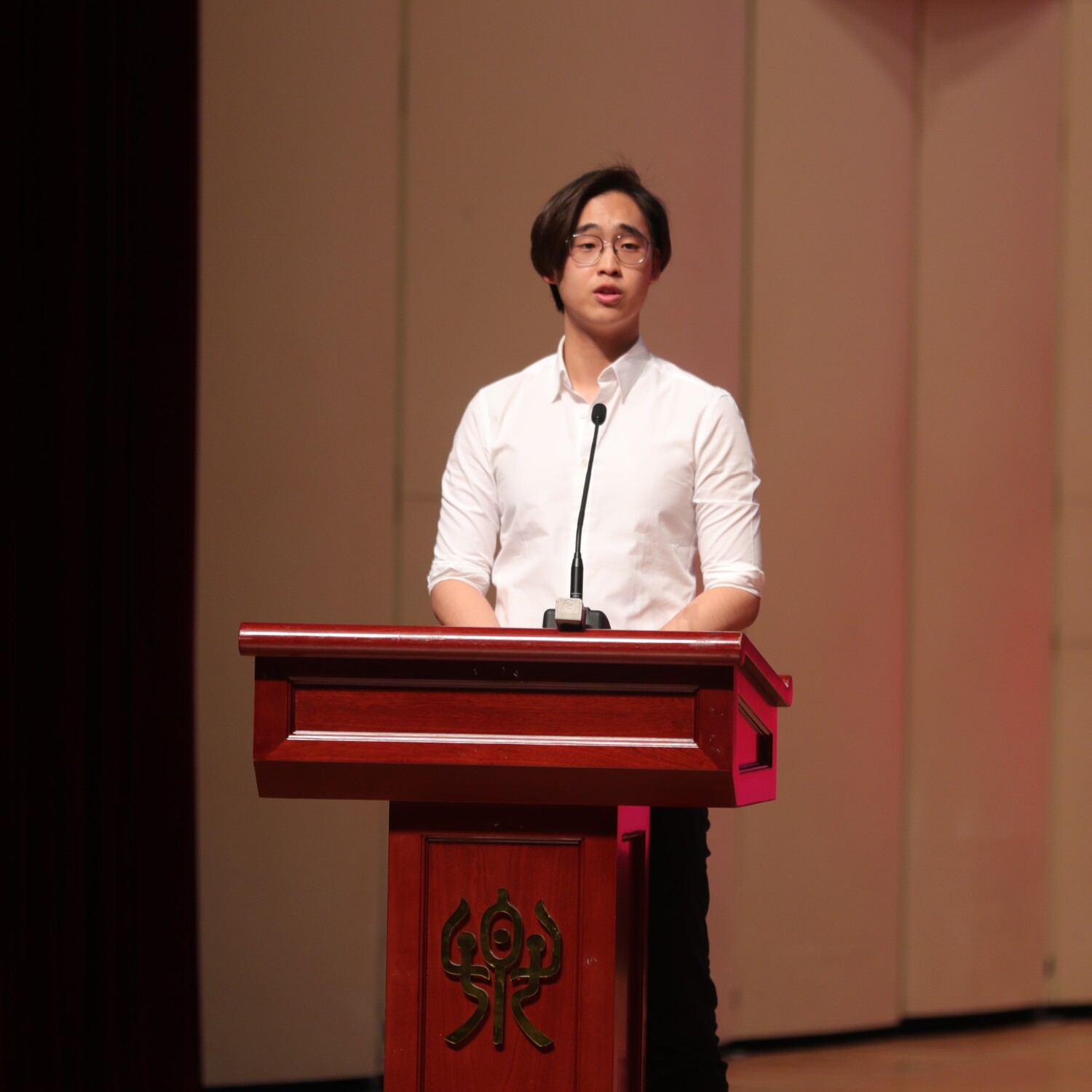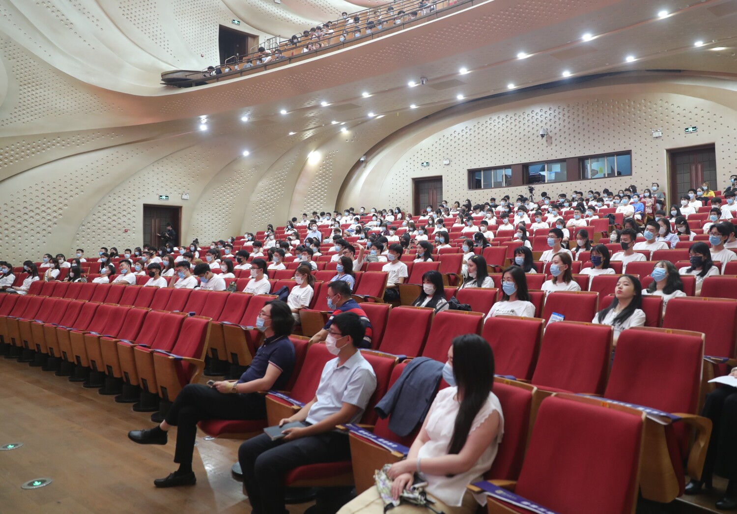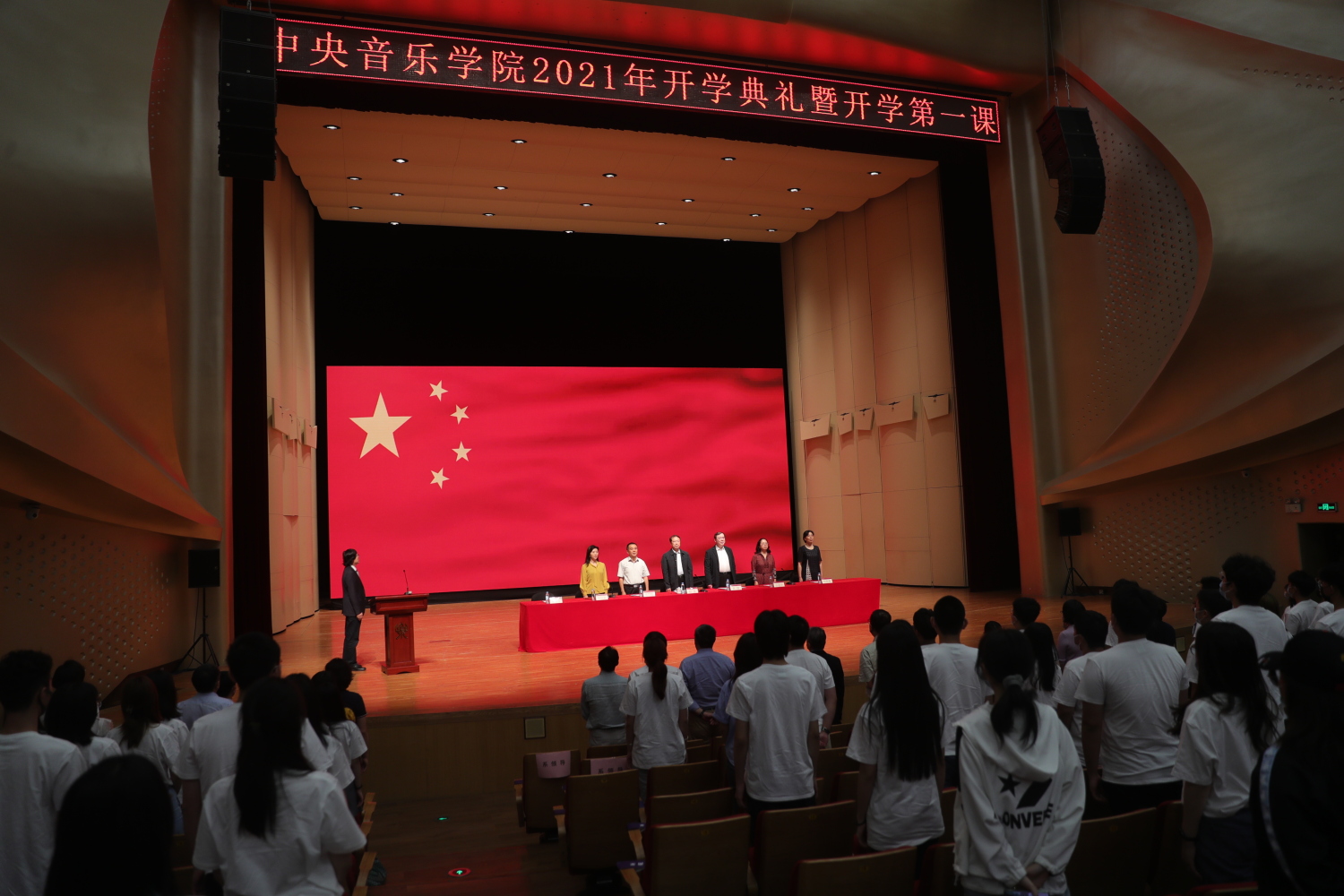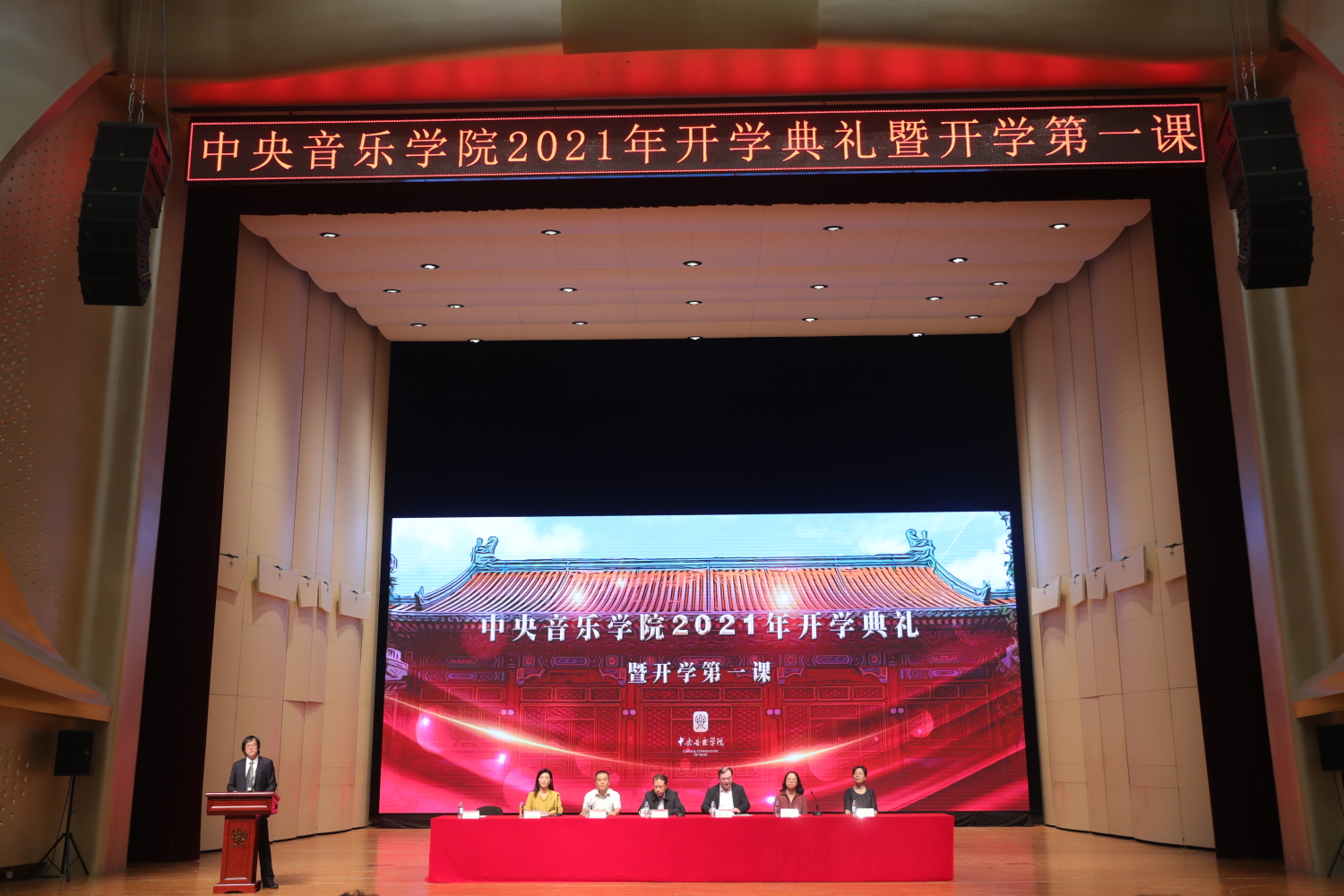 2021级全体本科新生和新入职教师及全体校领导、各院系领导在歌剧音乐厅主会场参加典礼,2021级全体研究生在教学楼通过视频参会。大会由副校长秦文琛主持。