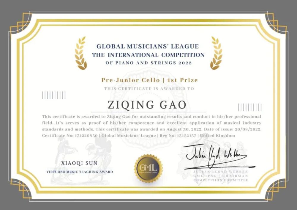 在刚刚落幕的2022年全球音乐家联盟国际钢琴和弦乐大赛( Global Musicians ' League the International Competition of Piano and Strings 2022)中,永利附小六年级大提琴专业学生高子晴经过激烈角逐,脱颖而出,以优异的成绩荣获Pre-Junior Cello组一等奖(指导教师:孙晓淇副教授)。