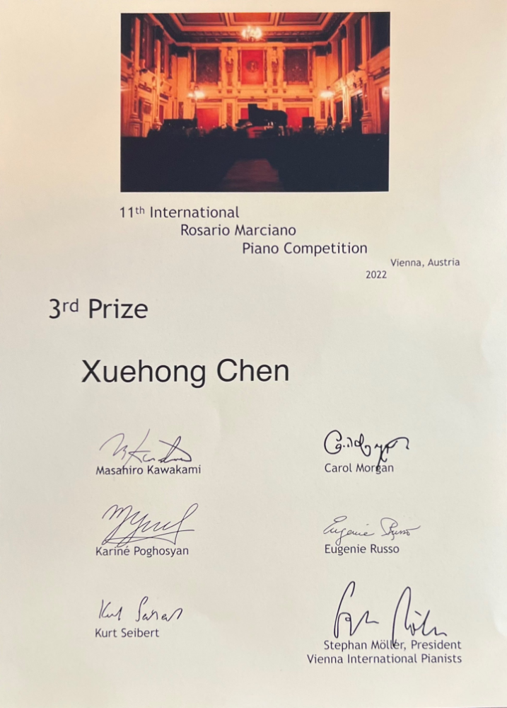 在刚刚结束的第十一届维也纳罗萨里奥·马西亚诺(Rosario Marciano)国际钢琴比赛中,钢琴系学生陈学弘(本科2018级、研究生2022级)获得大赛第三名。