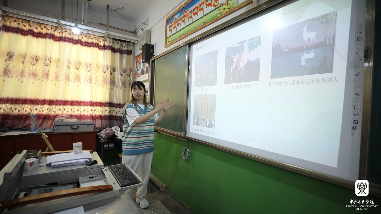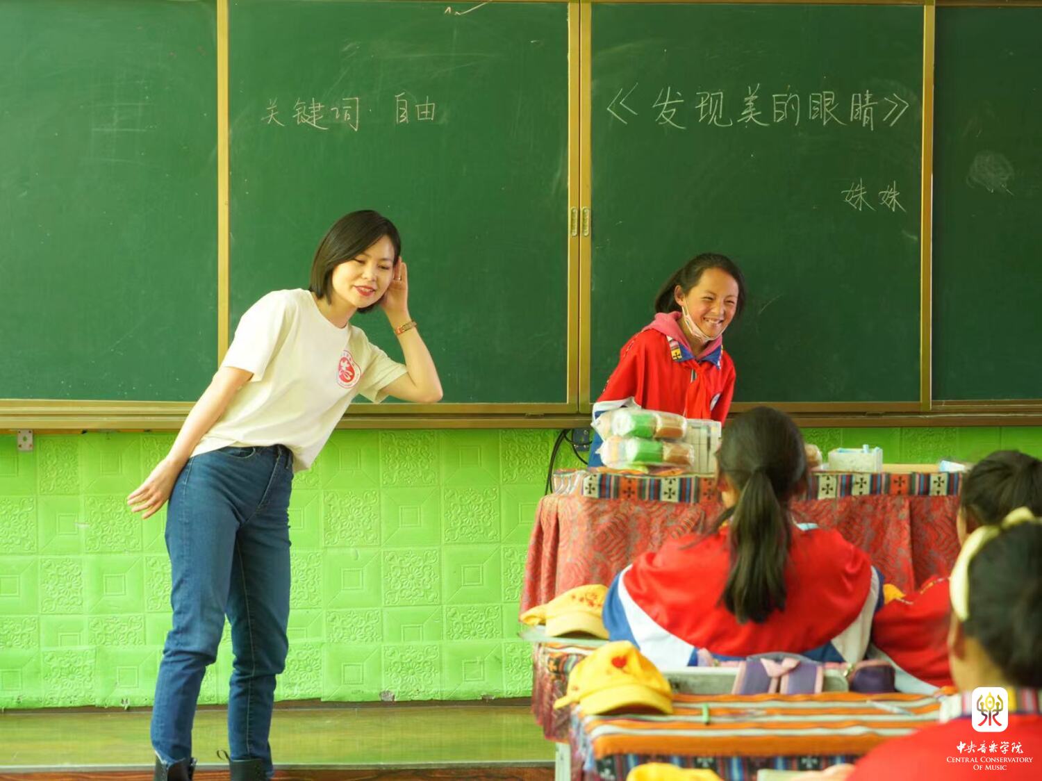 ‘到西部去,到基层去,到祖国和人民最需要的地方去’是央音人心中的呐喊。在拉萨青少年实践基地,我经历了做宣讲师以来最‘难’的一堂音乐课——上一秒还在吸着氧,下一秒就调整好状态站上讲台。孩子们亮晶晶的眼神里,写满了对音乐知识的渴求,我又怎能懈怠?‘各民族,齐奋发,争朝夕,兴中华......’歌曲《兴中华》旋律简单、节奏感强,孩子们学得很快,稚嫩清脆的歌声飘满了整个教室。在课堂中,我设计了由中国地图引入、到学唱歌曲、再由这首歌的节奏型引入一些藏族舞蹈的简单动作,加强孩子们对节奏把握的准确性,同时又厚植民族团结情怀。课堂气氛热烈,在陶冶老师的帮助下,孩子们都学得特别快。
