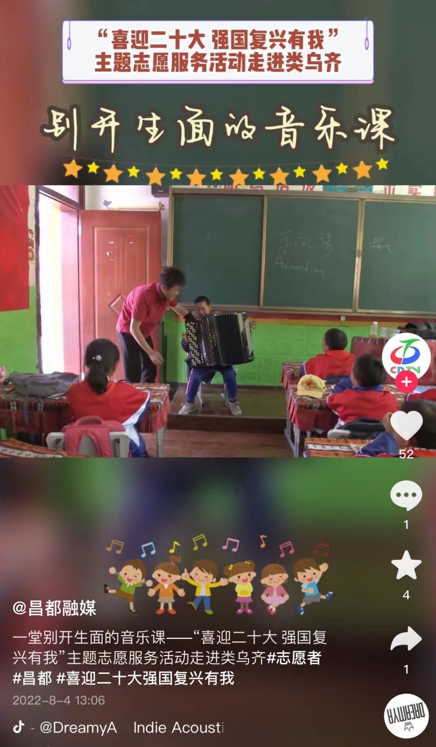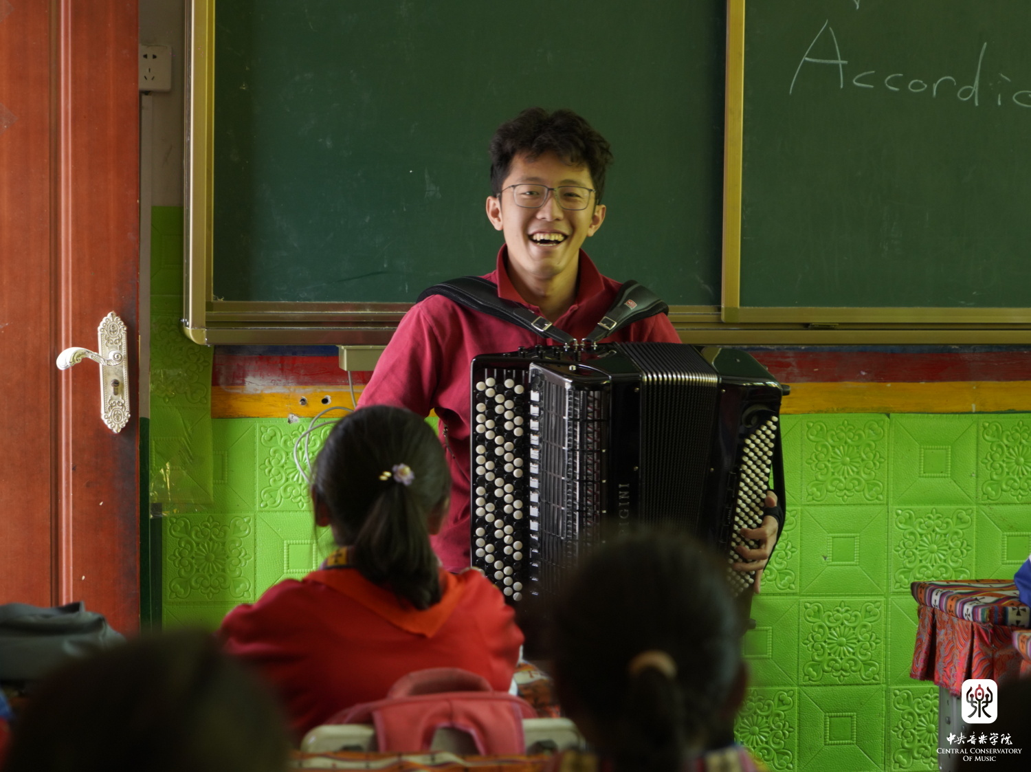 文艺宣讲师李杨冠宇和毛俊澔结合自身专业,为类乌齐镇小学的孩子们带来了一场生动的音乐课。两位宣讲师边讲边演,第一次近距离接触古筝和手风琴的孩子们十分好奇,课堂气氛热烈。