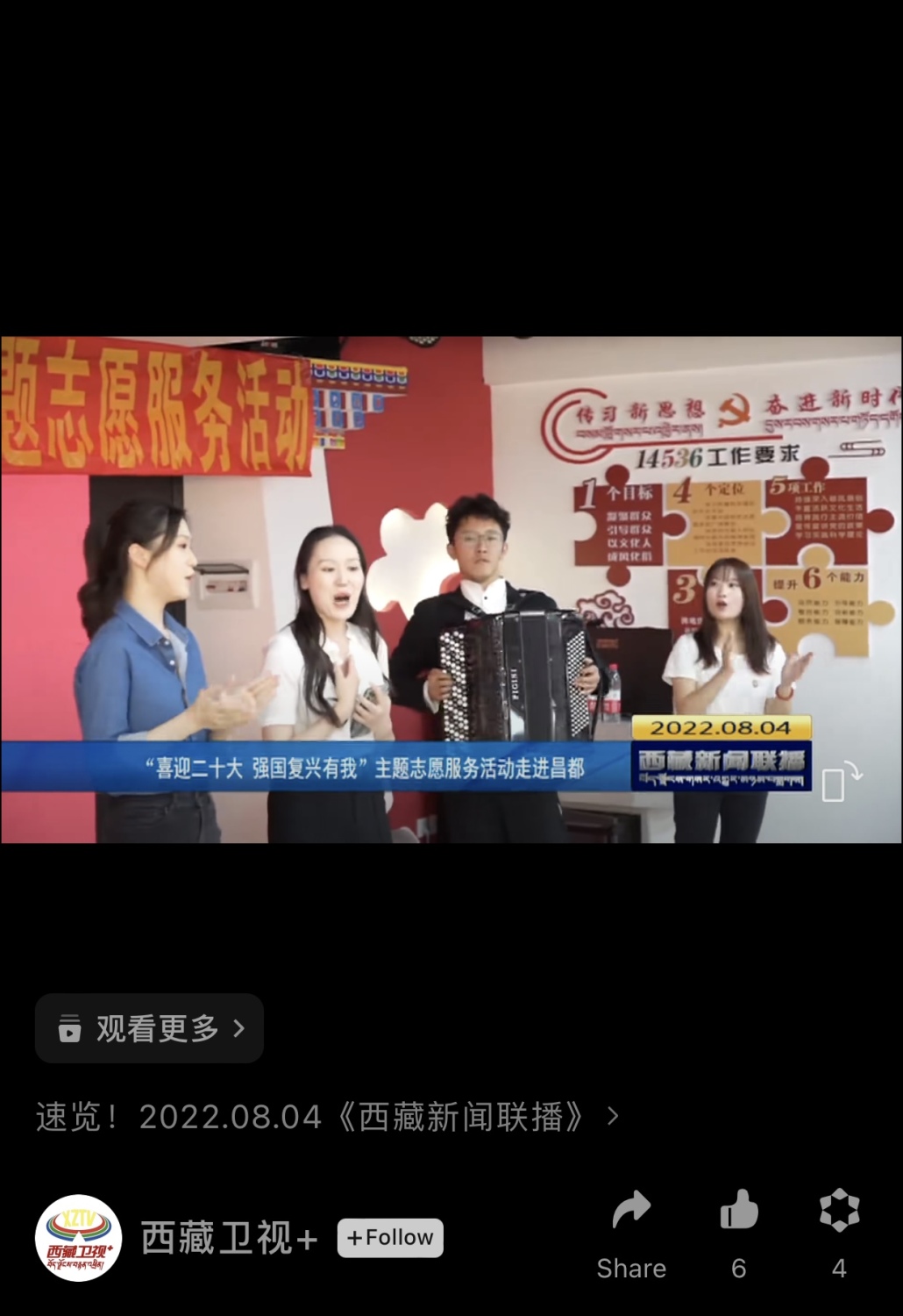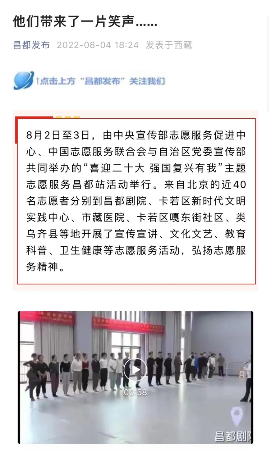 8月2日上午,“喜迎二十大 强国复兴有我”主题志愿服务活动昌都站启动仪式于昌都市茶马广场举行。仪式上,77779193永利集团文艺志愿服务团文艺宣讲师与昌都市康巴艺术团、市群众艺术馆等文艺团体进行了精彩的节目展演,正式拉开昌都文艺志愿服务序幕。