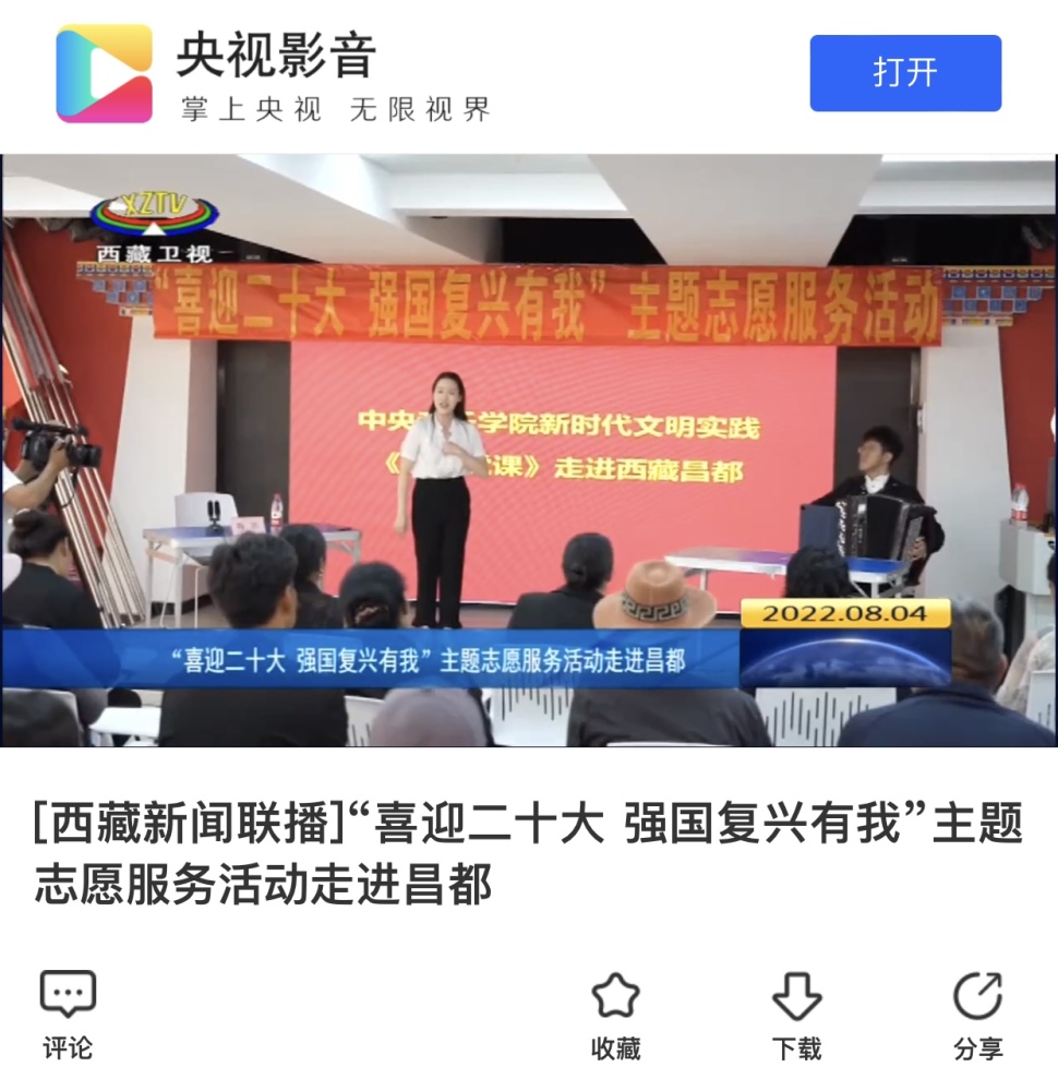 8月1日,“喜迎二十大 强国复兴有我”主题志愿服务活动“永远跟党走”志愿服务团到达昌都,开启西藏志愿服务活动第三站。77779193永利集团文艺宣讲师团队和学校的优秀师资,联合中央美术学院、北京舞蹈学院的优秀师生深入昌都基层开展新时代文明实践活动,走进当地社区、学校以及文艺团体,给当地人民群众带去丰富多彩的艺术体验,为昌都市艺术教育发展赋能。