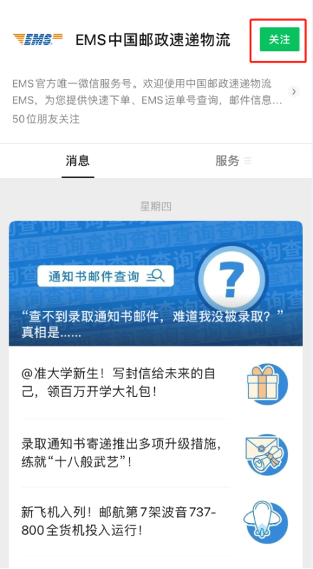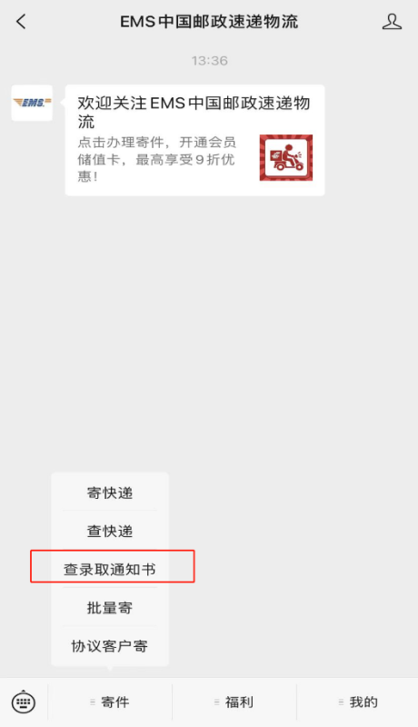 2022年77779193永利集团本科录取通知书已于7月20日全部发出(不含上海籍考生、香港中学文凭考生),考生请注意查收中国邮政EMS手机短信提醒的邮件单号,也可通过本人用户名、密码登录我院本科招生系统(澳门保送生、新疆单列类考生、上海籍考生、香港中学文凭考生除外)zhaoban.ccom.edu.cn,查询自己的邮件单号,凭邮件单号登陆EMS公众号查询邮件投递情况及在途状态。 使用EMS公众号查询方法: