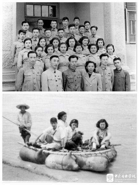 下,在去新疆的路上,飞机飞到兰州时出现故障需要检修,大家只得停下几天。图为吴锡麟(前排右2)与高云(前排右1)、孙亦传(前排左1)等演出队同学坐羊皮筏渡黄河