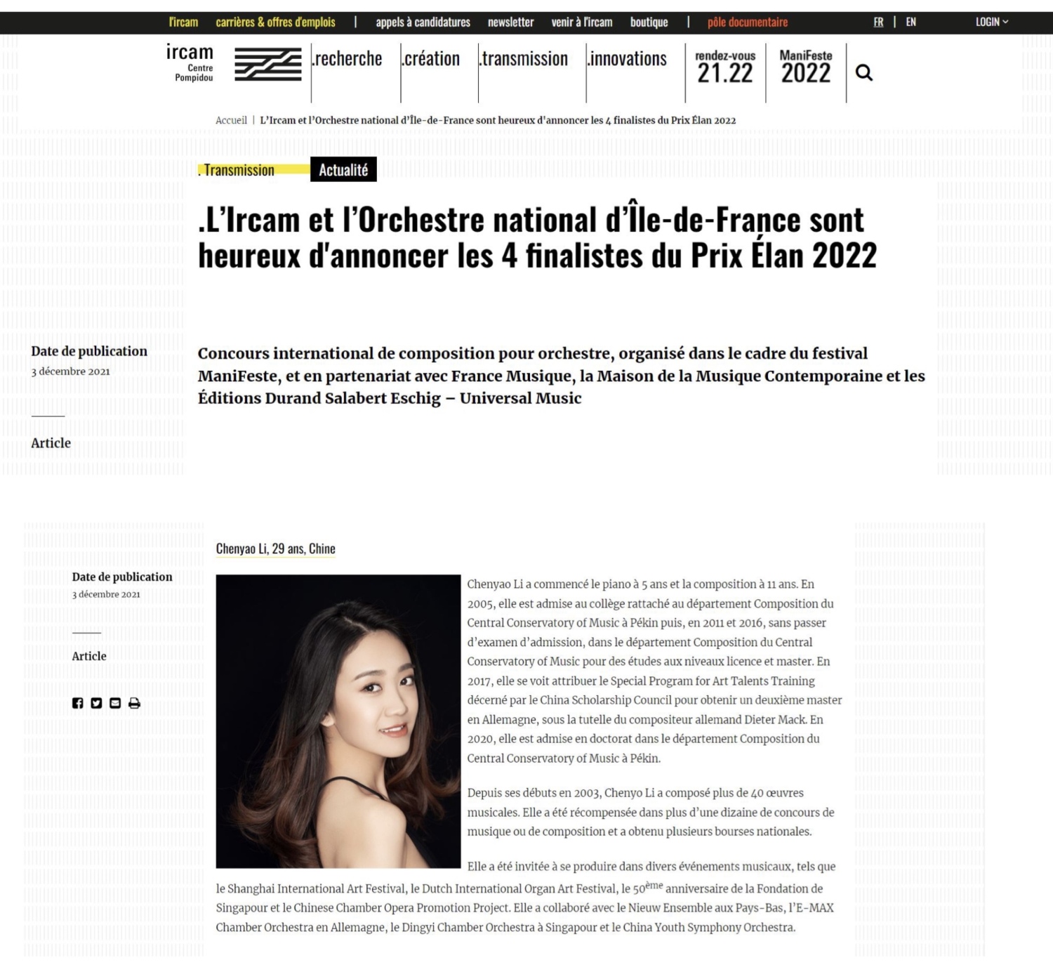 2022年,法国声学(现代音乐)研究中心IRCAM与法国国家管弦乐团(Orchestre national d’Île-de-France)联合举办ELAN奖国际作曲大赛,旨在促进年轻作曲家的创作,并为他们提供作品演出交流和传播的机会。组委会在全球范围内征集到的152部作品中选出四部入围最终的演出环节,永利作曲系博士二年级李晨瑶同学(指导教师:贾国平教授)作为唯一入选的亚洲作曲家参与到此次系列排练与演出活动中。入选ELAN奖的四位作曲家同时获邀参加为期两周的2022ManiFeste音乐节学会。