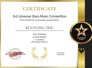 2022年第三届环球之星音乐比赛是得到世界音乐家联盟支持的网络比赛。旨在发掘全球的音乐人才,为其提供展示自己的平台。此届比赛有来自 17 个国家的 322 名候选人参加了这次比赛。评委都是世界知名的国际音乐会艺术家、音乐家,或者来自各大院校的资深教授和教育家。最终永利本科一年级学生朱若彤(指导教师:沈凡秀)凭借出色的技艺与表现获得艺术家组金奖。