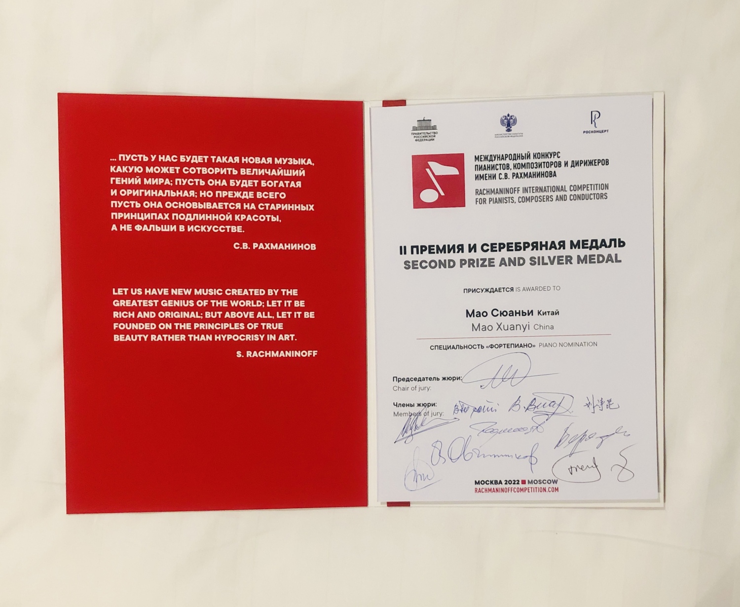 首届拉赫玛尼诺夫国际音乐(钢琴、指挥和作曲)大赛(Rachmaninoff International Competition for Pianists, Composers and Conductors)于 2022年6月15日至27日在俄罗斯首都莫斯科举行。本次大赛是为纪念20世纪俄罗斯著名作曲家、钢琴家、指挥家拉赫玛尼诺夫诞辰150周年而举办的,旨在保护和推广拉赫玛尼诺夫创作遗产、发掘有才华的年轻音乐家并为其创造更多的专业活动条件。拉赫玛尼诺夫国际音乐大赛原则上每四年举办一次,本次大赛吸引了来自 35 个国家的 500 名参赛者报名,而指挥专业报名人数更是多达250多位。此次大赛面向全球观众现场直播,在近两个星期的赛程中,直播面辐射了 71 个国家,超过 600 万人次观看比赛。