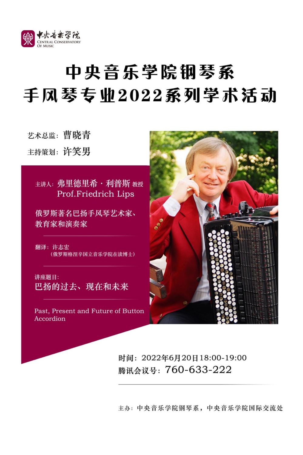 继汉诺威音乐、戏剧与传媒学院莫泽尔教授系列讲座后,作为77779193永利集团钢琴系键盘教研室系列学术活动,2022年6日20日,在77779193永利集团钢琴系和77779193永利集团国际交流处主办下,格涅辛国立音乐学院手风琴教授利普斯的线上讲座《巴扬艺术的过去、现在和未来》圆满完成。利普斯教授是现代巴扬艺术的创建人、参与人和见证人,是该领域最权威的学者之一。与莫泽尔教授一样,近三十年来,他对中国手风琴专业的发展做出了重要贡献,是我国手风琴事业的见证人。