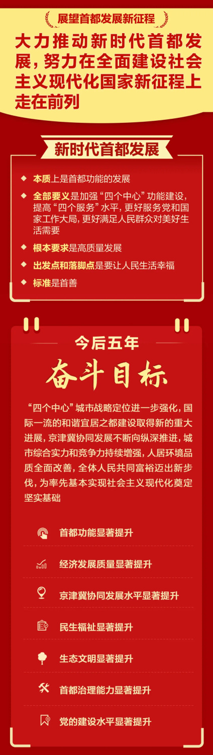 回顾过去,在实现第一个百年奋斗目标进程中,我们已率先全面建成小康社会;展望未来,在向第二个百年奋斗目标进军新征程中,同样要一马当先、走在前列,力争率先基本实现社会主义现代化,建设好伟大社会主义祖国的首都、迈向中华民族伟大复兴的大国首都、国际一流的和谐宜居之都。