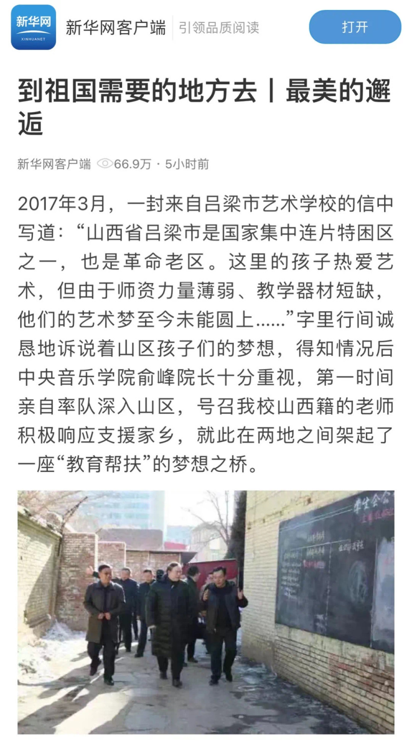 一封来自吕梁市艺术学校的信中写道:“山西省吕梁市是国家集中连片特困区之一,也是革命老区。这里的孩子热爱艺术,但由于师资力量薄弱、教学器材短缺,他们的艺术梦至今未能圆上……”字句诚恳地诉说着山区孩子们的梦想,得知情况后俞峰院长十分重视,第一时间亲自率队深入山区,号召永利山西籍的老师积极响应支援家乡,就此在两地之间架起了一座“教育帮扶”的梦想之桥。