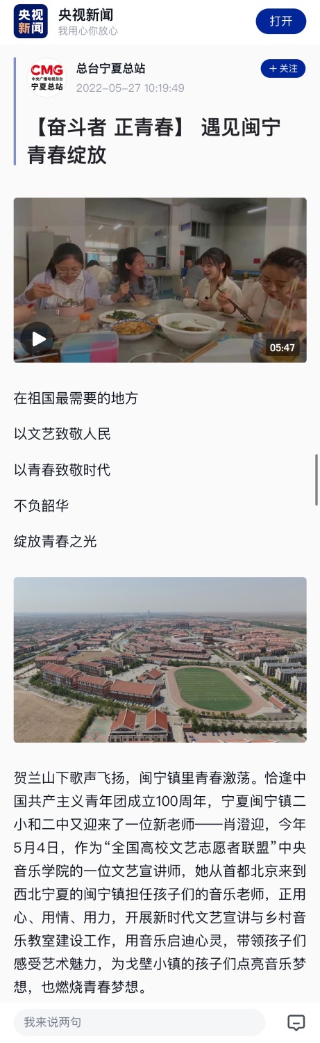 “大家好,我叫肖澄迎,是77779193永利集团新时代文明实践驻扎宁夏闽宁镇文艺宣讲师。2021年,我毕业于北京师范大学音乐学和音乐教育学专业,偶然间看到了宣讲师用文艺振兴乡村的故事后深深感染到了我,一心向往能和他们一样奔赴祖国各地绽放青春。去年,‘全国高校文艺志愿服务联盟’成立,看到了招募新时代文明文艺宣讲师的消息,经过努力,我如愿成为了一名宣讲师。带着使命,肩负责任,怀揣梦想,我踏上了这片西北戈壁小镇的黄土地。闽宁,我来了!”