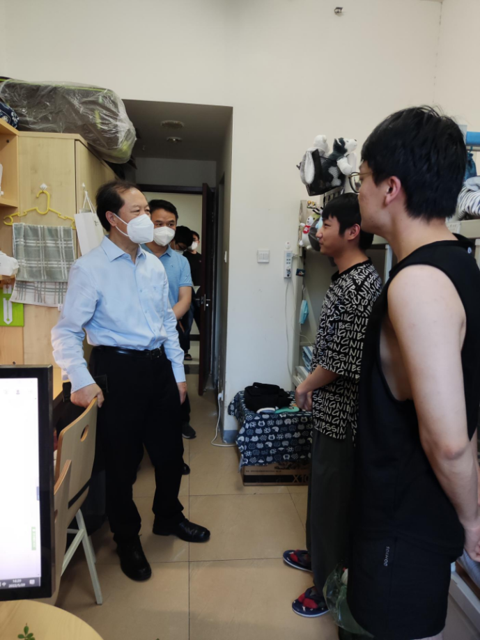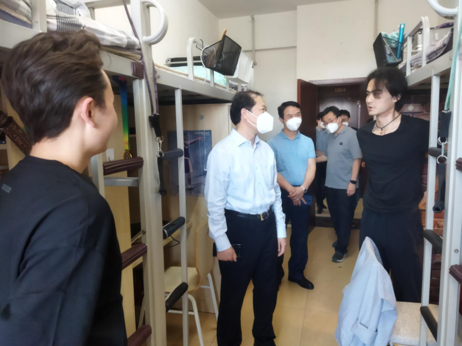 校园封闭管理期间,同学们的身心健康和后勤保障是校领导最挂念的事。在男研303宿舍赵旻书记看到从部队退役的声歌系毕业研究生何凡同学,仍保持部队习惯坚持锻炼身体时,他要求同学们在紧张的学习之余一定要多锻炼身体。同时叮嘱后勤部门,一定要为同学们积极主动地做好服务。