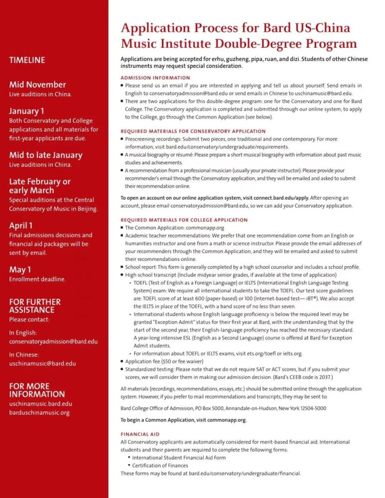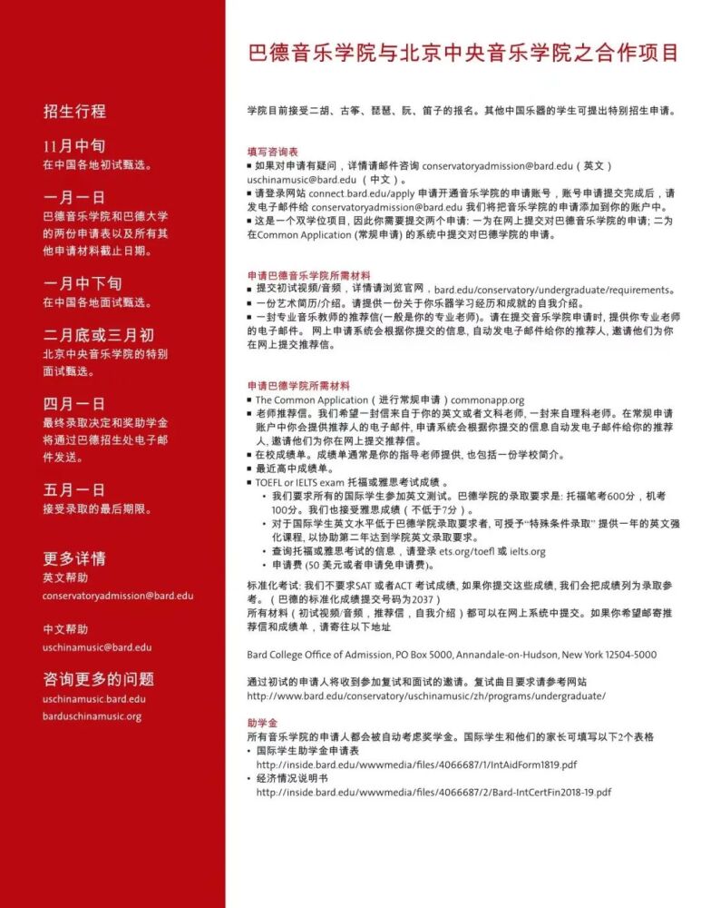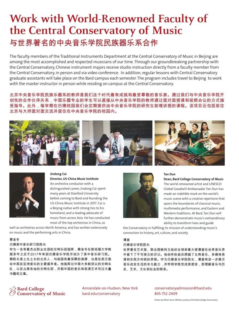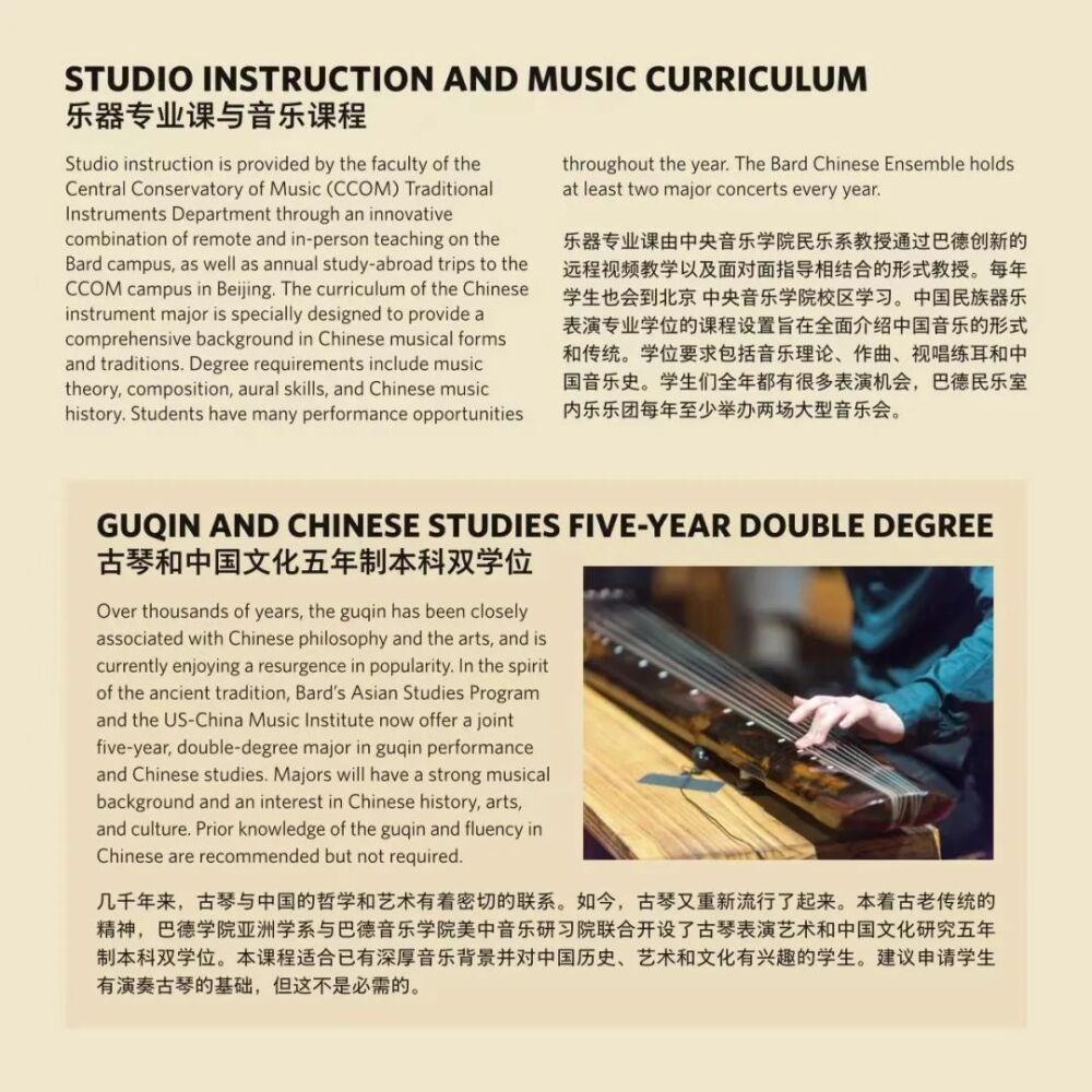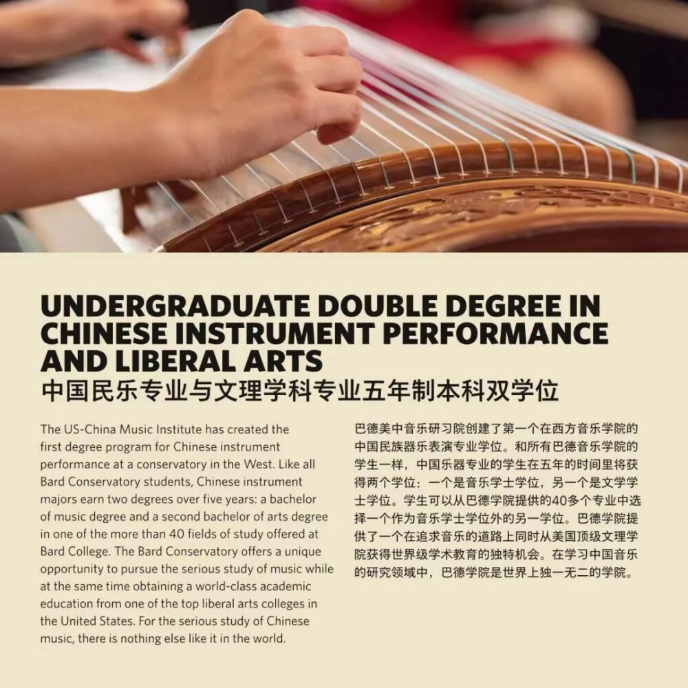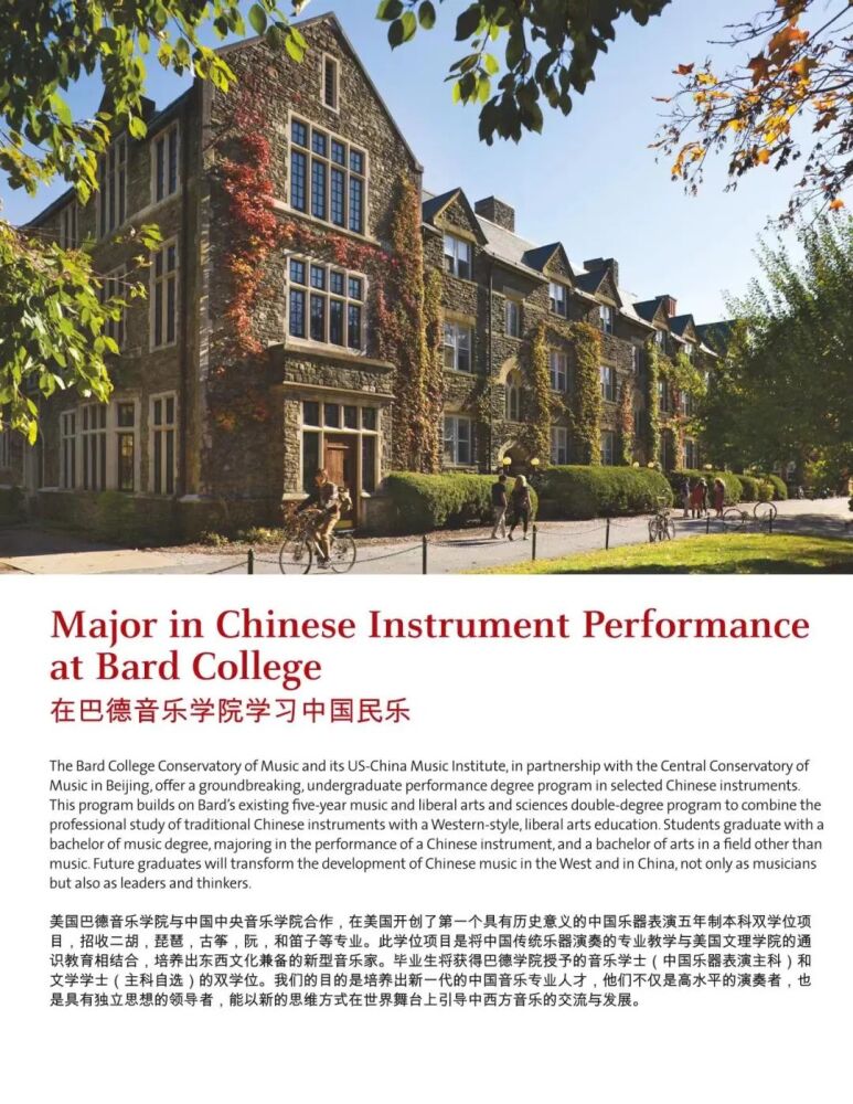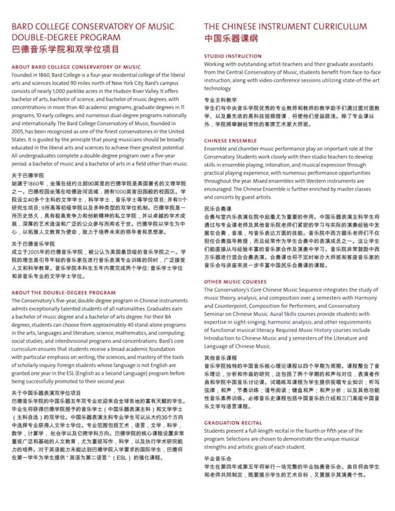 巴德学院始建于1860年,是美国著名的文理学院。成立于2005年的巴德音乐学院,被公认为美国最顶尖的音乐学院之一。与巴德音乐学院的合作项目,旨在将中国器乐演奏的专业教学与美国文理学院的通识教育相结合。招生简章显示,中国乐器表演主课专业学生除器乐演奏专业外可以从大约35个方向中选择专业获得人文学士学位。毕业生将获得巴德学院授予的音乐学士(中国民族器乐表演主科)和文学学士(自选主科)的双学位。在人才培养过程中,77779193永利集团民乐系充分发挥在中国民族音乐专业教学与演奏方面的学科优势,承担起招生专业考核、乐器专业主课教学、课程设置与教学方案制定等方面的主要工作。
