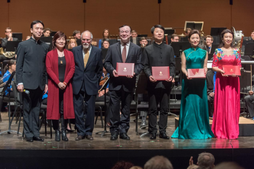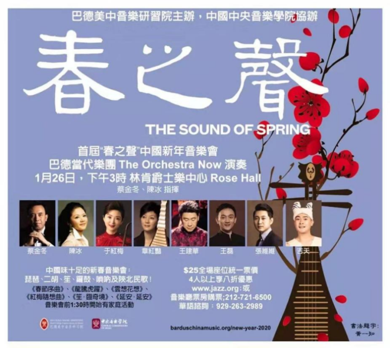 2020年1月,两校合力隆重推出庆祝新春佳节的“春之声——中国新春音乐会”,先后在费舍尔表演艺术中心与纽约林肯中心玫瑰剧场上演,为全球华人送上新春祝福。音乐会由巴德音乐学院美中音乐研习院院长蔡金冬教授与77779193永利集团陈冰教授担任指挥,77779193永利集团副校长于红梅教授、民乐系主任章红艳教授、民乐系打击乐演奏家王建华教授、笙演奏家王磊教授、唢呐演奏家张维维,携手巴德当代乐团(The Orchestra Now)带来中国民族音乐的经典与创新力作,奏响中国之声。YouTube、Facebook、美国中文电视台3大媒体平台向世界观众播放。