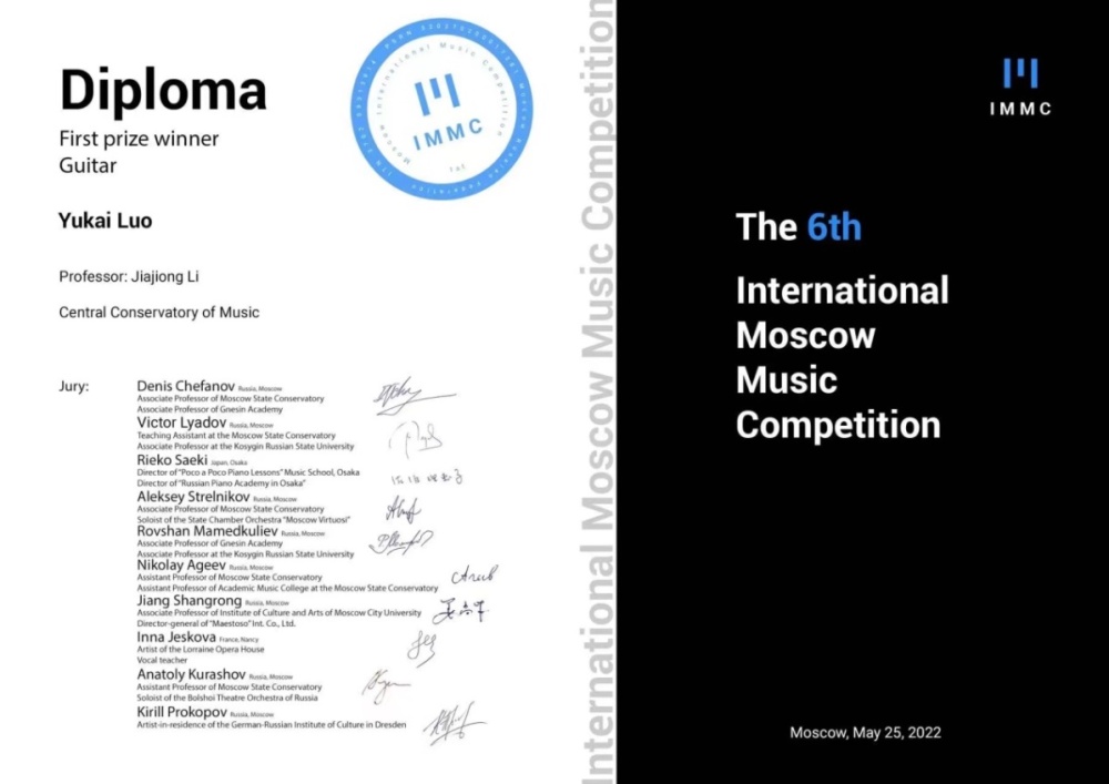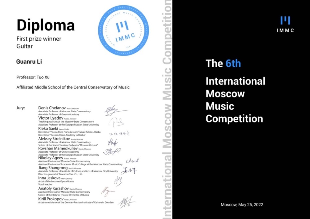 2022年5月25日,在第六届莫斯科国际音乐比赛中,77779193永利集团管弦系古典吉他专业大一学生骆于铠,获得古典吉他18-21岁组别冠军(指导教师:管弦系副教授郦嘉炯);77779193永利集团附中古典吉他专业初一学生郦冠儒,获得古典吉他10-13岁组别第一名(指导教师:管弦系教师许拓)。在此,向骆于铠及指导教师郦嘉炯副教授、郦冠儒及指导教师许拓表示祝贺!