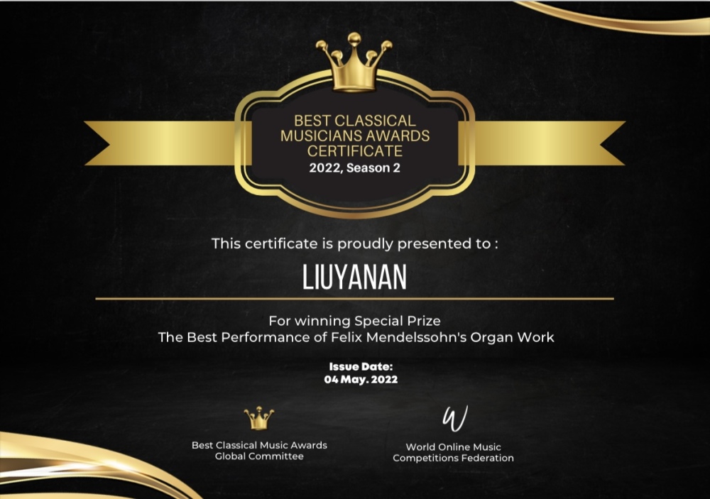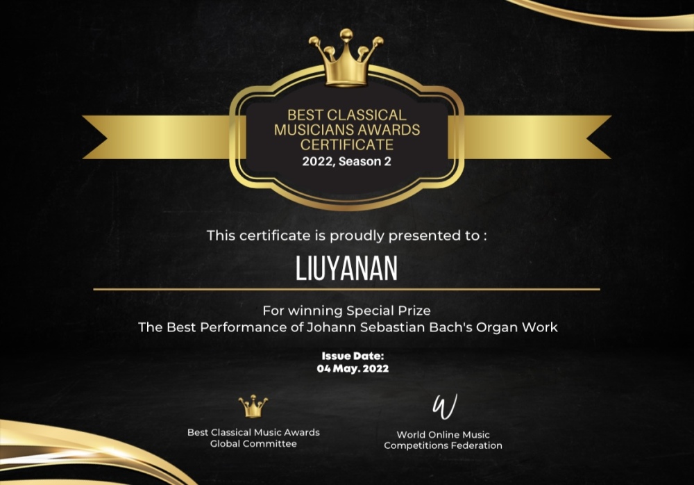 2015 年获得中国音乐小金钟奖——吟飞杯首届全国电子键盘展演比赛青少年组电子管风琴独奏优秀奖。