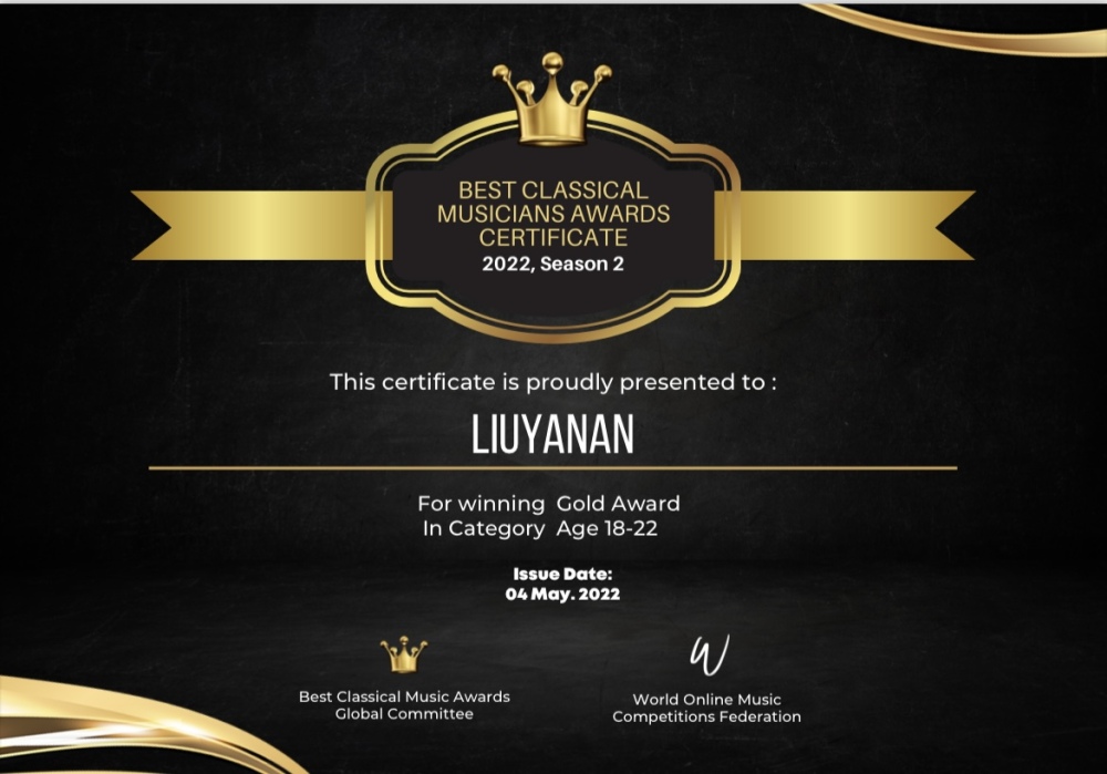 2022年夏季最佳古典音乐家大奖赛Best Classical Musicians Awards (BCMA)由世界在线音乐比赛联合会,英国True Art 古典音乐数字电视台新古典音乐家杂志联合举办。