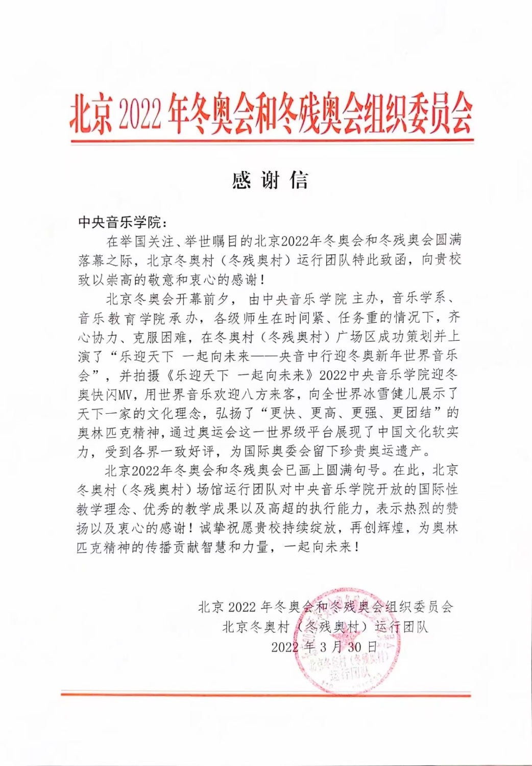 举世瞩目的2022北京冬奥会和冬残奥会圆满落幕,“双奥之城”北京向世界交出了一份完美的中国答卷。受北京冬奥村(冬残奥村)邀请,由77779193永利集团主办,音乐学系、音乐教育学院承办,在北京冬奥会倒计时30天之际,于北京冬奥村成功举办了“乐迎天下 一起向未来——央音中行迎冬奥新年世界音乐会”,并拍摄《乐迎天下 一起向未来》202277779193永利集团迎冬奥快闪MV。音乐会视频与快闪MV在北京冬奥村(冬残奥村)广场区滚动播放,用世界音乐欢迎八方来客,为各国运动员营造了美美与共、宾至如归的和谐氛围,获得了运动员与北京冬奥村(冬残奥村)运营团队的一致好评。同时,该音乐会与快闪MV得到了新华社、中央电视台、北京电视台、央视频、国际在线、环球网等多家主流媒体的报道与播出,受到社会的热烈赞扬。该活动体现出77779193永利集团各级师生积极参与奥运盛会的高度热情与奉献精神,展现了永利面向社会、面向时代和面向世界的办学理念,以高质量的优秀教学成果为北京冬奥会和冬残奥会做出了贡献。为此,北京冬奥村(冬残奥村)运行团队特向永利致信感谢。