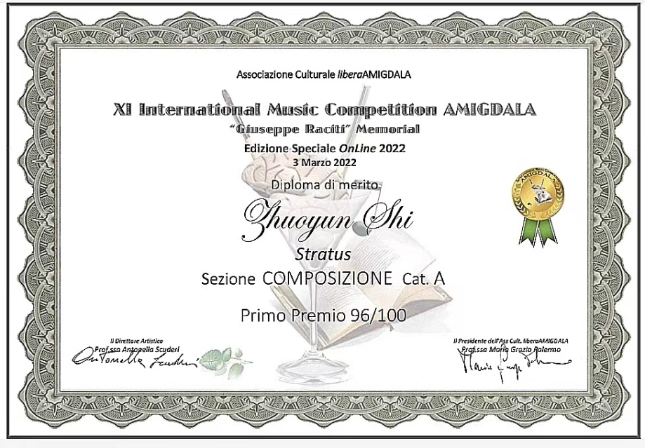 永利作曲专业施卓芸的长笛独奏作品《stratus》在意大利阿米格达拉纪念“朱塞佩•拉奇蒂”国际音乐比赛 X International Music Competition AMIGDALA “Giuseppe Raciti” Memorial 的独奏作品组以本组最高96分的成绩获得一等奖第一名。