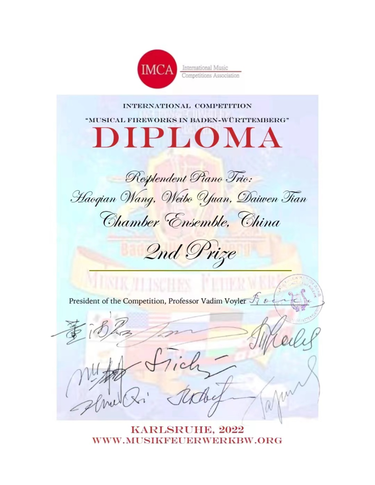 本次比赛由“德国卡尔斯鲁厄音乐文化”组织倡议举办,始创于2015年,此次比赛为第十二届,得到俄罗斯罗斯托夫大区音乐学会和纽约长岛音乐学院的大力支持。评委会主席由德国著名音乐家、教育家瓦迪姆·沃伊勒(VADIM VOYLER)先生担任。面向全球不同专业和不同年龄段的音乐家,是年轻有前途的人才以及大学和高等教育机构的专业人士参与的国际性比赛。评委由来自于德国、俄罗斯、美国、瑞典、奥地利和中国等多个国家的音乐家所组成。最终,经过激烈的角逐,来自77779193永利集团附中初二年级学生王皓仟(钢琴)、田戴文(大提琴)、初三年级学生袁伟博(小提琴)三位同学获得了本届比赛室内乐组二等奖!