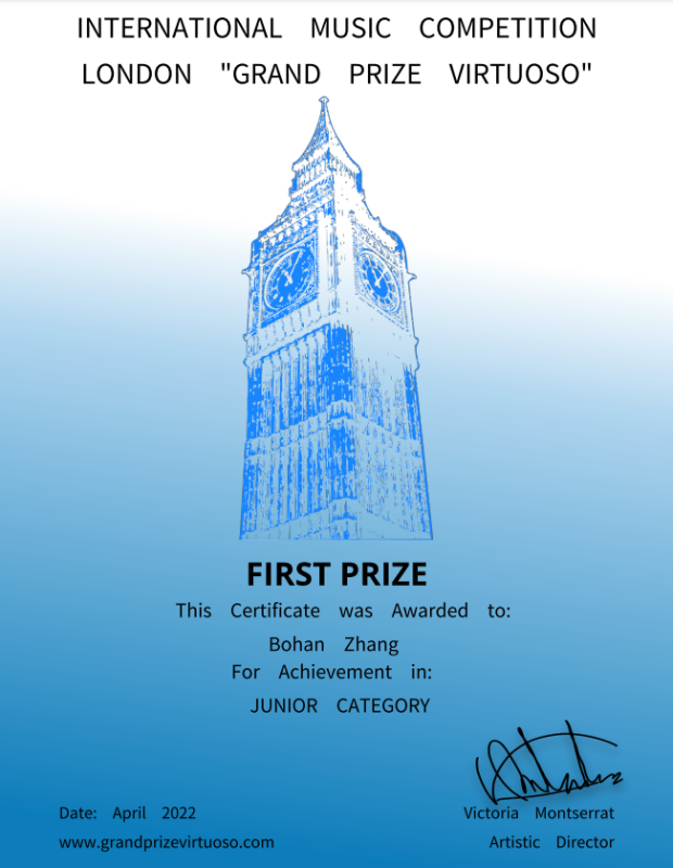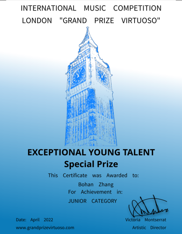 2022年英国伦敦“艺术家大奖赛”是由欧洲艺术家大奖赛协会举办,面向所有国籍和年龄段,包含弦乐、钢琴、管乐、声乐和室内乐,每一科目分为不同年龄组:Young Musician(8 岁及以下)、Junior(9至12 岁)、Intermediate(13至15 岁)、Advanced(16至18 岁)以及 Senior(无年龄限制);室内乐分为三个年龄组:A组(12 岁以下)、B组(13到18岁)和C组(19岁及以上)。比赛目的是发现拥有杰出人格的艺术家并为其提供奖励,以帮助他们开展国际生涯,其中特别奖项旨在寻找拥有强大艺术人格和舞台表现力的演奏者。由于受疫情影响,本次比赛通过视频和网络举行,经过评委会层层筛选,最终评选出优胜者。