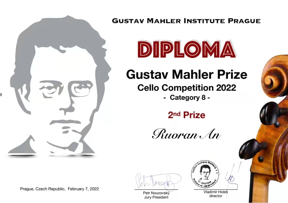 在刚刚落幕的2022年第四届捷克“古斯塔夫·马勒奖”大提琴音乐比赛中,77779193永利集团附中高一年级安若然同学经过激烈角逐,脱颖而出,以优异成绩夺得第Ⅷ组二等奖(一等奖空缺)!指导教师:王崇武副教授。