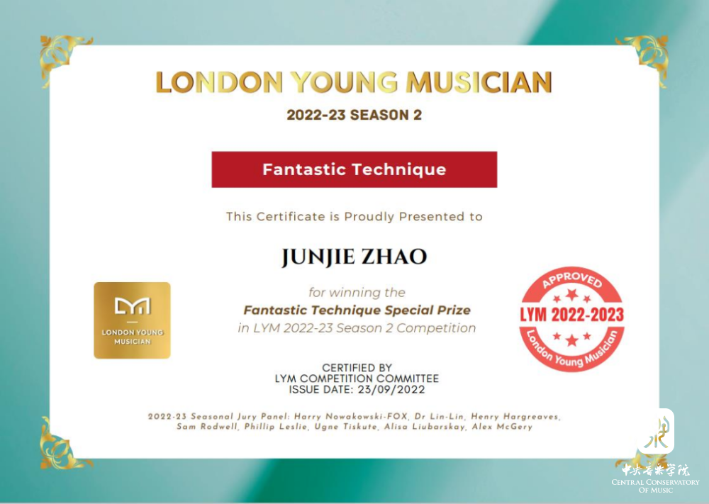 管弦系本科小提琴专业一年学生赵俊杰荣获伦敦青年音乐家大赛金奖及最佳演奏特别奖、美国2022王者之巅国际古典音乐比赛第一名