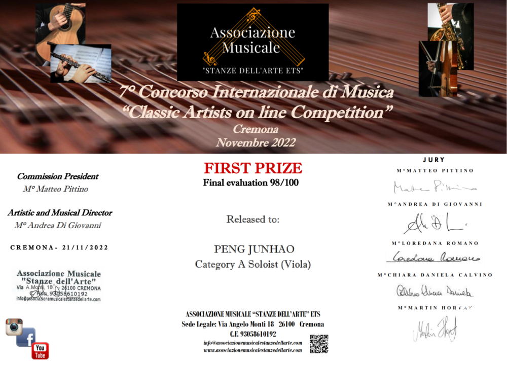 附中二年级中提琴专业彭俊豪荣获“ 2022意大利克莱蒙纳国际音乐大赛A组(A组:不超过14岁)特等奖