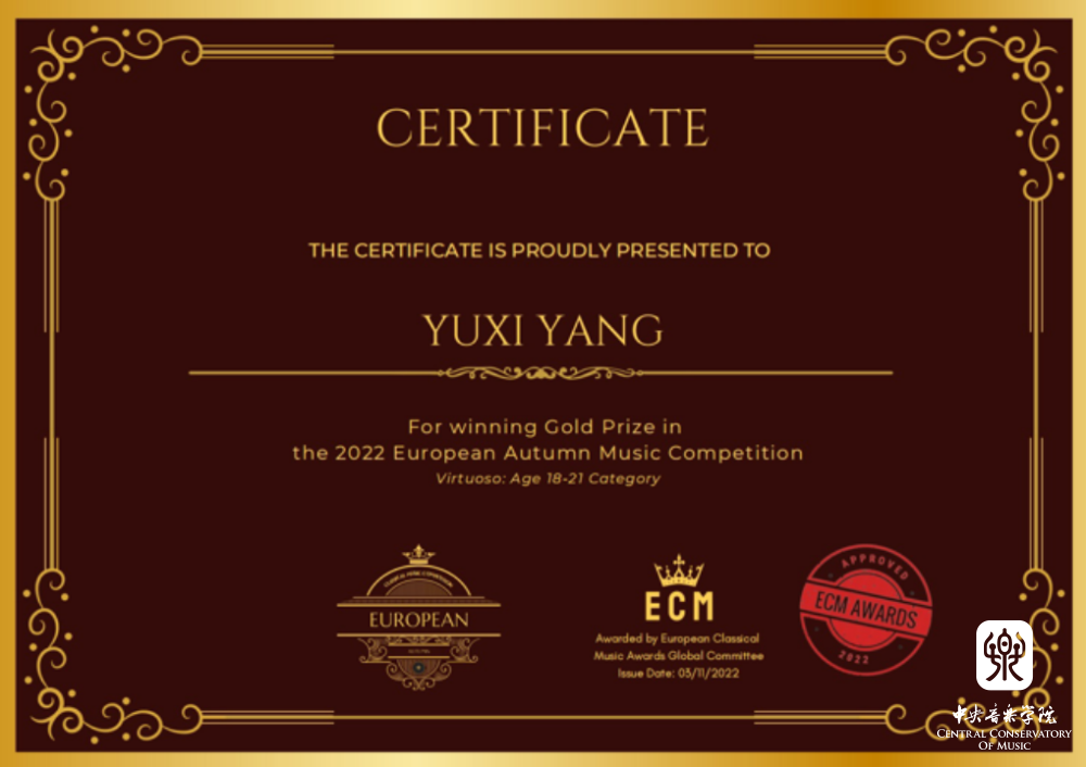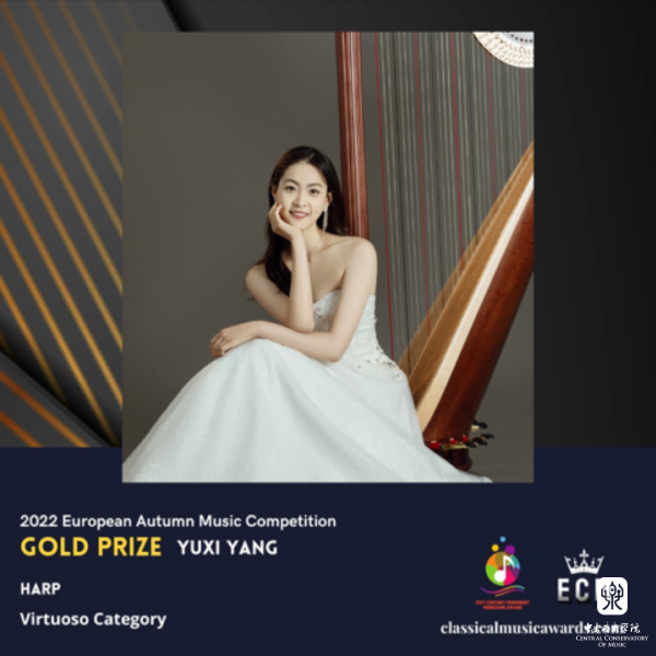 2021级管弦系本科竖琴专业学生杨雨茜于2022年11月,荣获欧洲古典音乐奖(ECM)金奖。