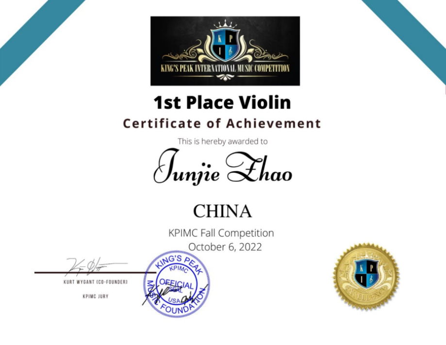 美国2022王者之巅国际古典音乐比赛证书