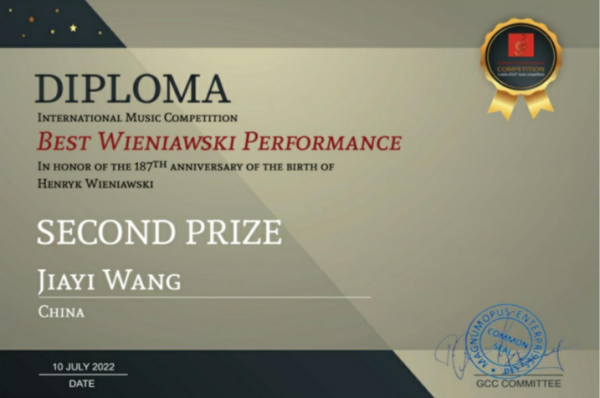 王佳怡荣获欧洲夏季音乐比赛金奖、维尼亚夫斯基作品比赛二等奖