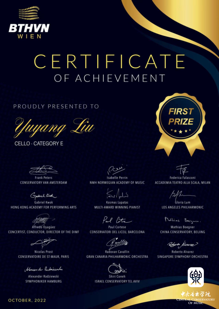 在刚刚结束的2022年维也纳贝多芬国际音乐比赛中,永利管弦系大提琴专业大一学生刘禹阳(指导教师:俞佳副教授)获得E组(17-18岁)一等奖。