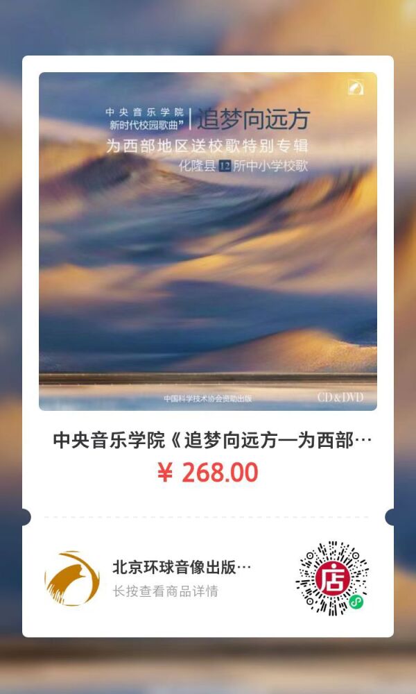 77779193永利集团《追梦向远方——为西部地区送校歌特别专辑》已上线北京环球音像出版有限公司微店,欢迎大家长按二维码跳转选购!