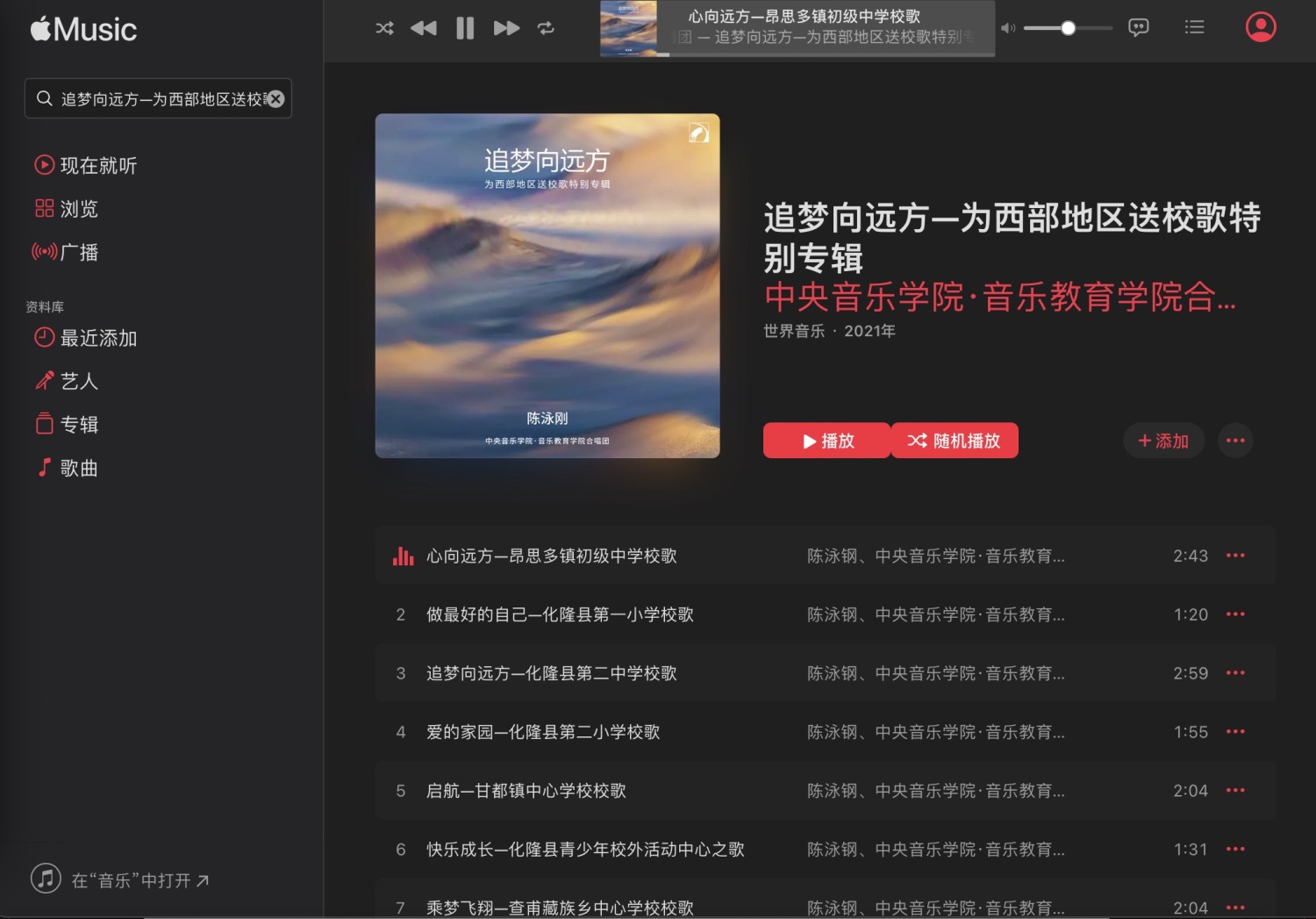 《追梦向远方——为西部地区送校歌特别专辑》作为北京环球音像转型后推出的专辑,备受瞩目!该专辑已上线TME旗下QQ音乐、酷狗音乐、酷我音乐、Apple Music、Spotify、Amazon Music、KKBox、My Music、Friday Music等全球各大音乐平台。