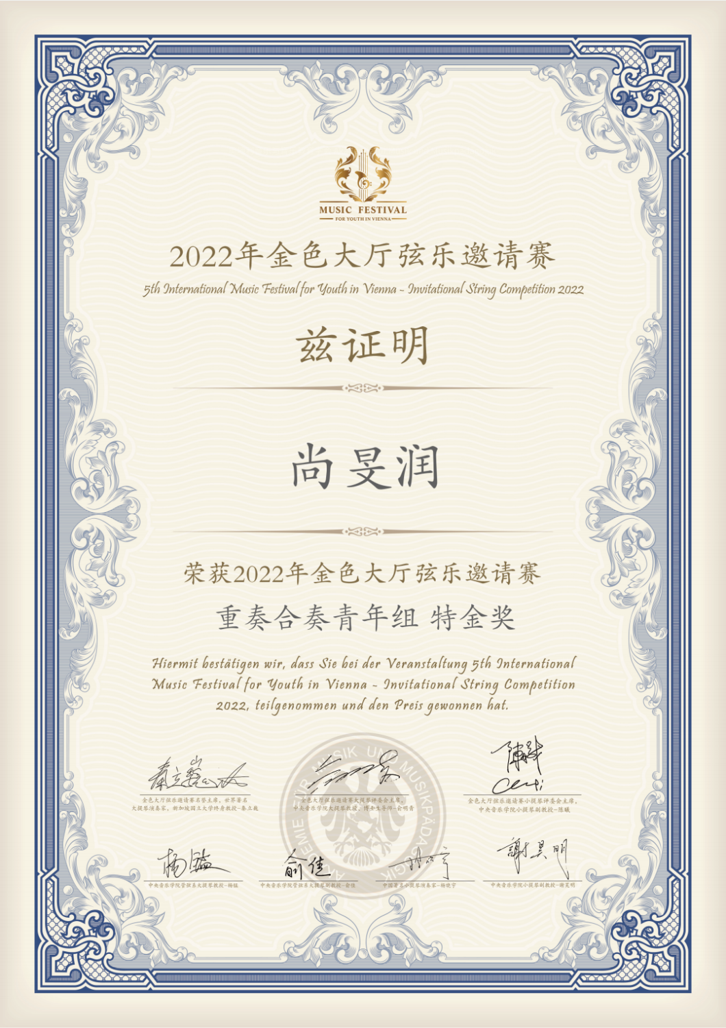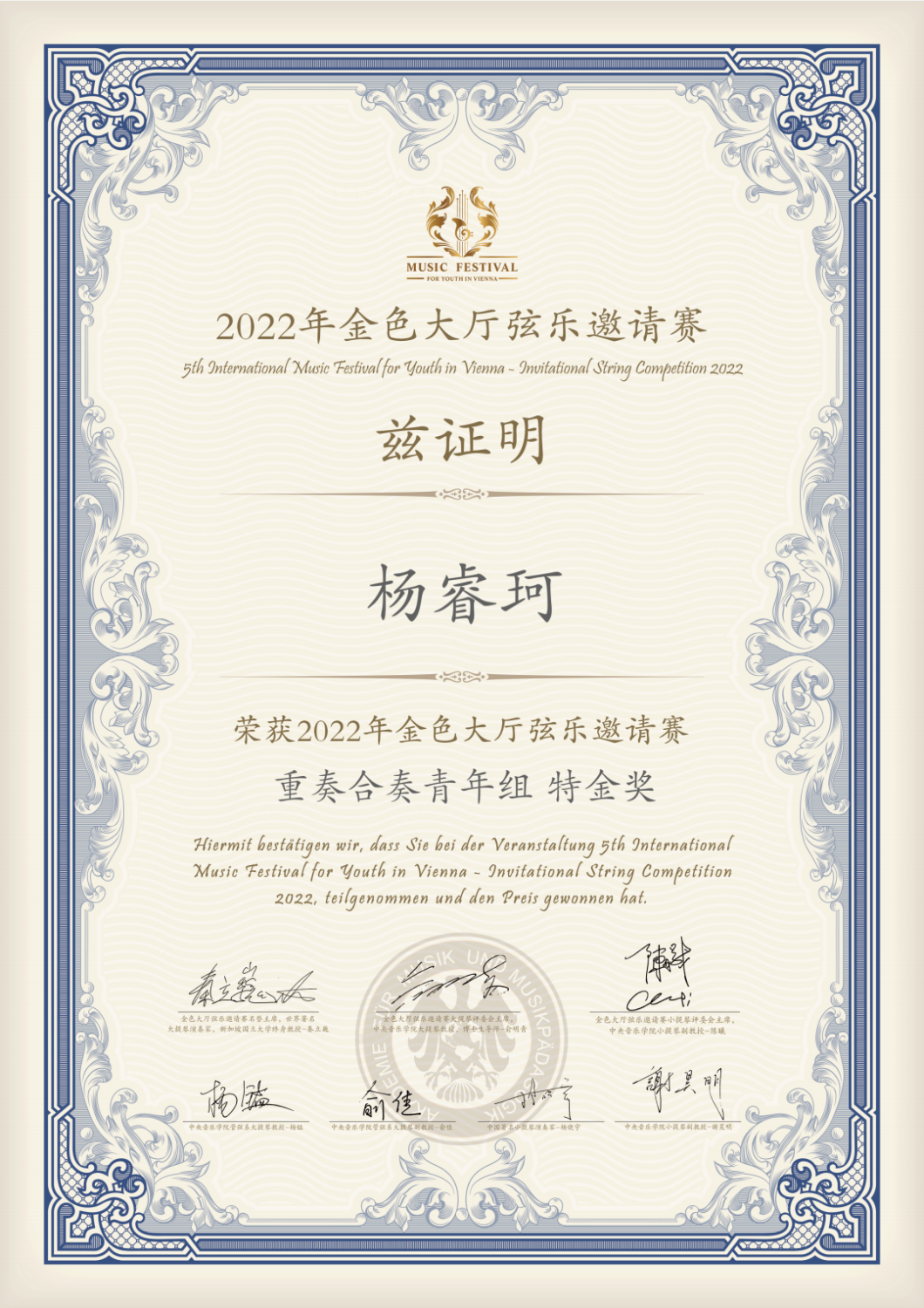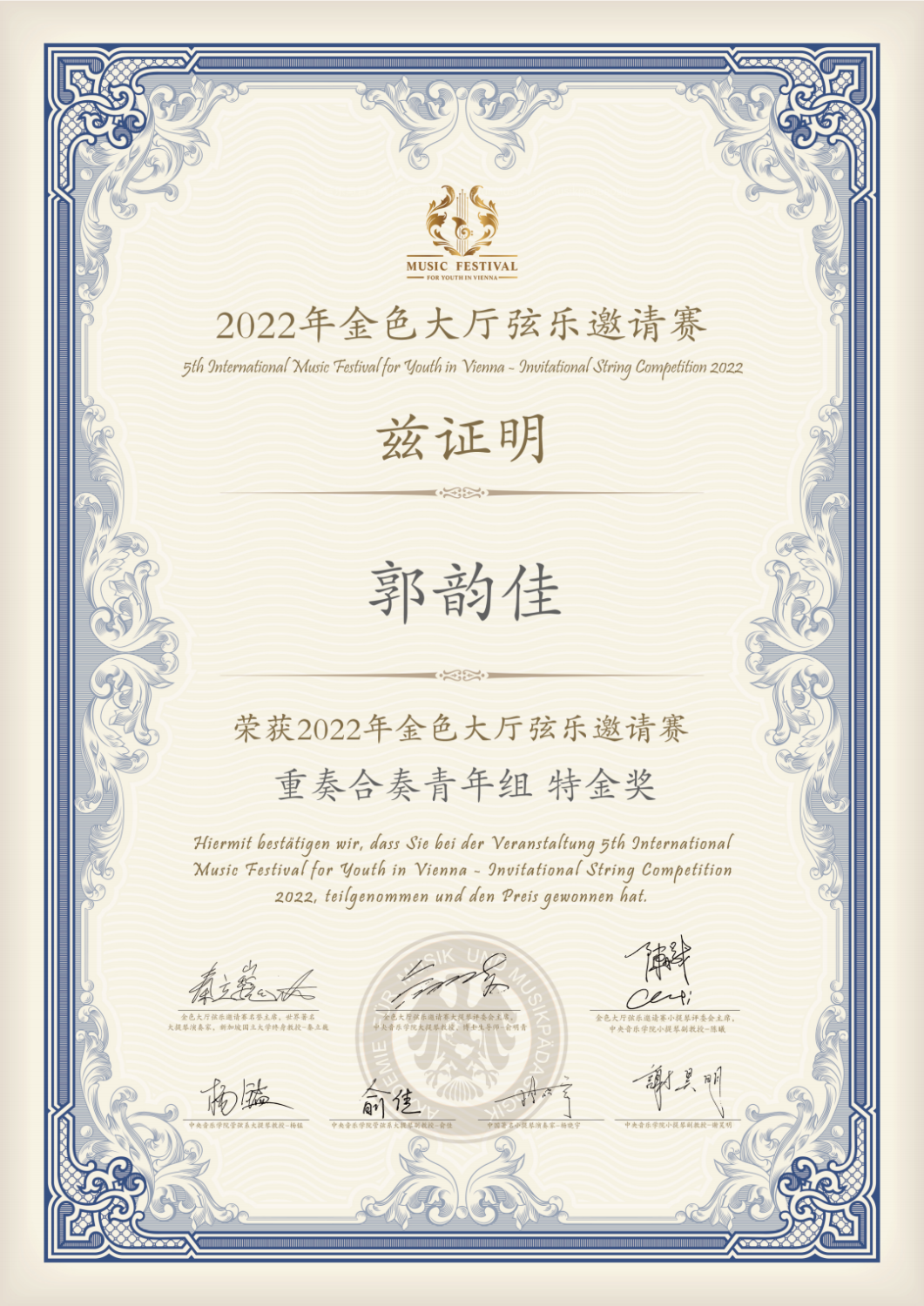 2022年9月获得第五届维也纳国际青少年音乐节2022年⾦色大厅弦乐邀请赛青年组特级⾦奖。