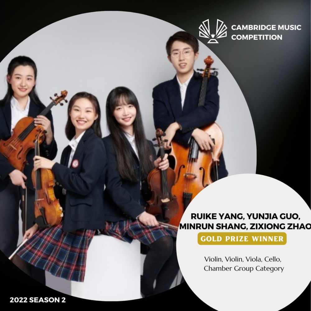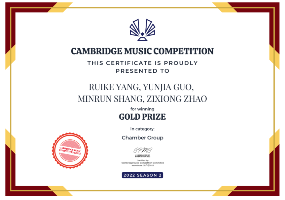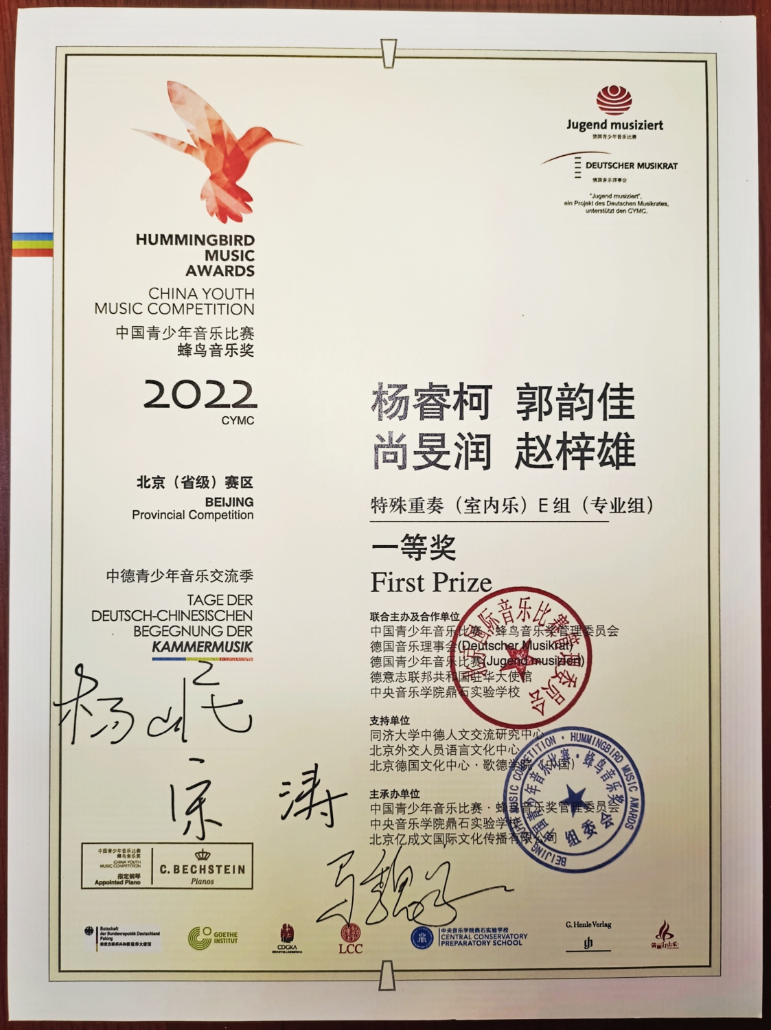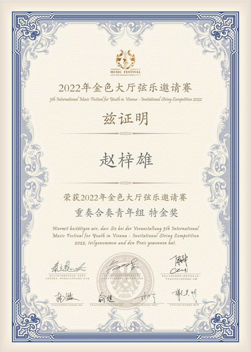 2022年9月获得第五届维也纳国际青少年音乐节2022年⾦色大厅弦乐邀请赛青年组特级⾦奖。
