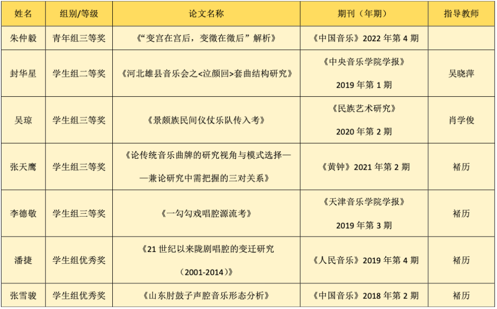 在中国传统音乐学会“第二届中青年论文评选”比赛中,永利音乐学系朱仲毅老师和封华星等六位学生获奖。获奖名单如下: